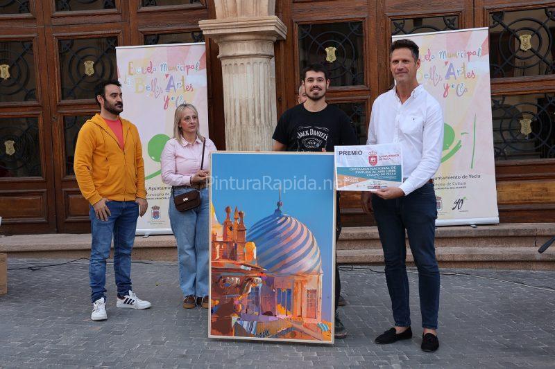 Una intensa jornada artística se vivió en Yecla con motivo del concurso de pintura rápida al aire libre celebrado en 2025, donde la creatividad de los artistas llenó de color las calles y rincones emblemáticos de la ciudad murciana. Sergio Rocafort se alzó con el Primer Premio gracias a una obra llena de fuerza cromática y precisión arquitectónica, protagonizada por una imponente vista de la cúpula de la Basílica de la Purísima, en contraste con un cielo de azul intenso.