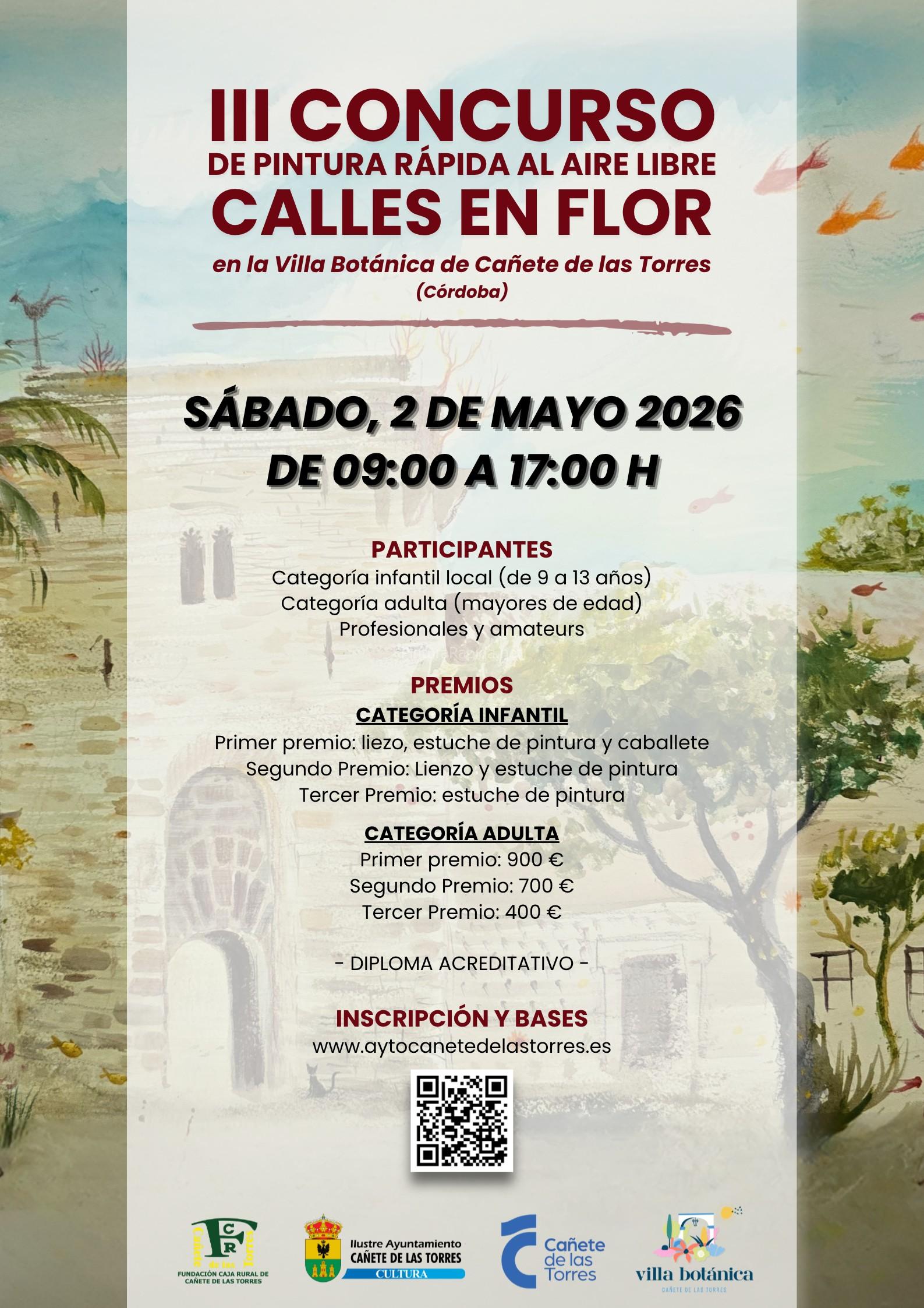 La Fundación Caja Rural de Cañete de las Torres junto con el Ayuntamiento de Cañete de las Torres, a través de su Concejalía de Cultura, convocan el III Concurso de Pintura Rápida al Aire Libre enmarcado en el evento Calles en Flor que se celebra en la localidad del 30 de abril al 3 de mayo de 2026.