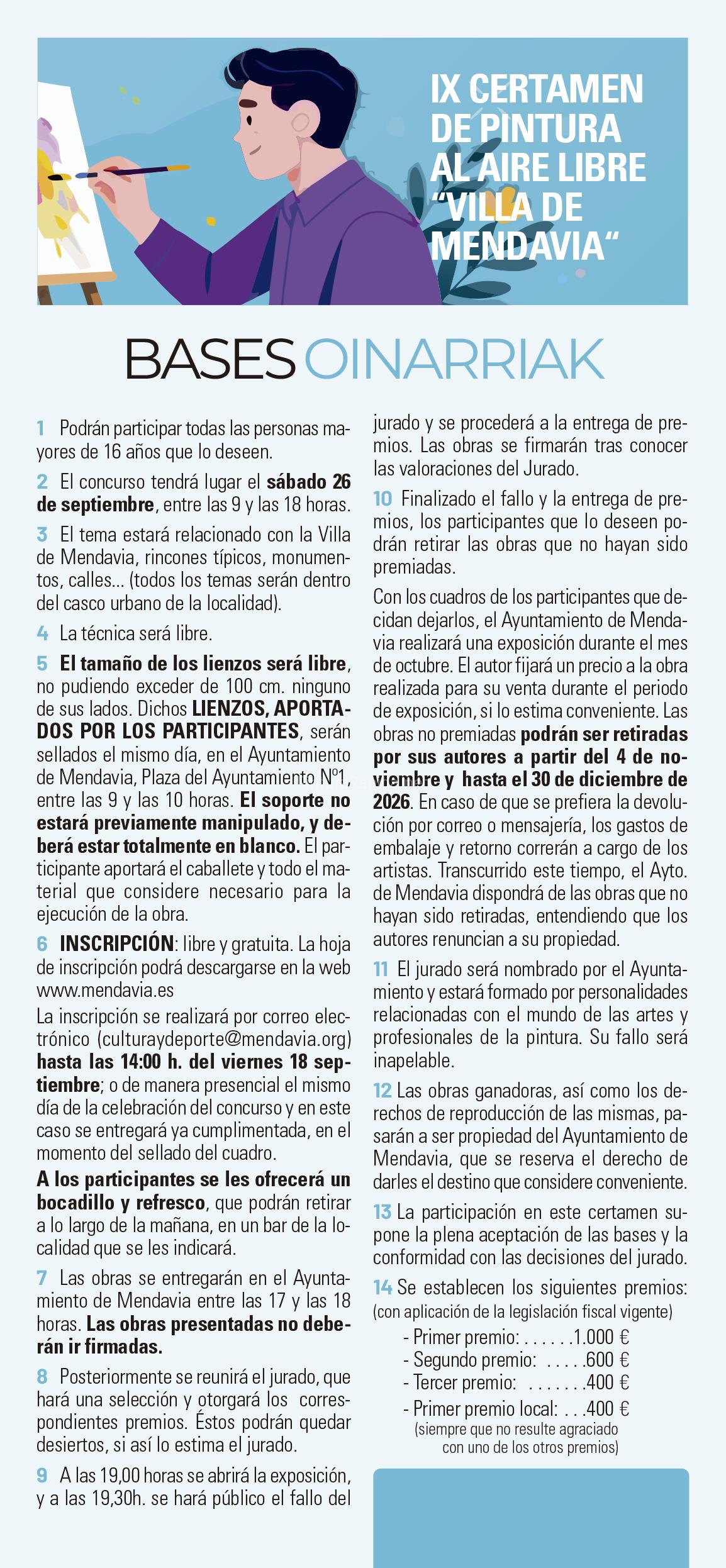 6 Inscripción: libre y gratuita. La hoja de inscripción podrá descargarse en la web www.mendavia.es. La inscripción se realizará por correo electrónico (culturaydeporte@mendavia.org) hasta las 14:00 h. del viernes 18 de septiembre; o de manera presencial el mismo día de la celebración del concurso y en este caso se entregará ya cumplimentada, en el momento del sellado del cuadro. A los participantes se les ofrecerá un bocadillo y refresco, que podrán retirar a lo largo de la mañana, en un bar de la localidad que se les indicará.