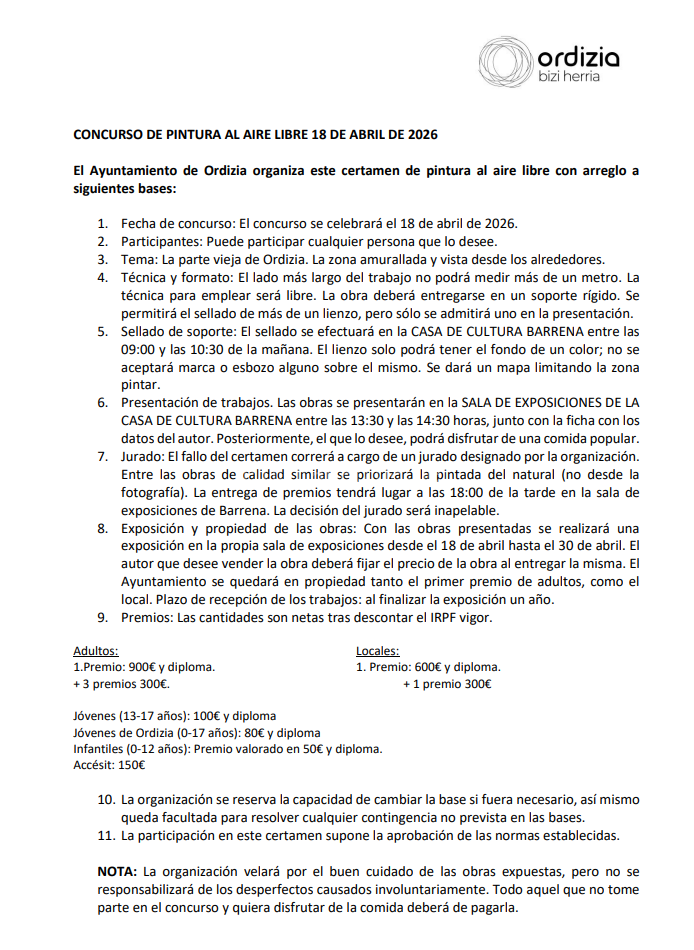 El Ayuntamiento de Ordizia organiza este certamen de pintura al aire libre con arreglo a siguientes bases:
