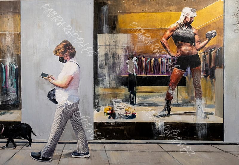su obra y de un plástico para proteger el suelo y mobiliario urbano que