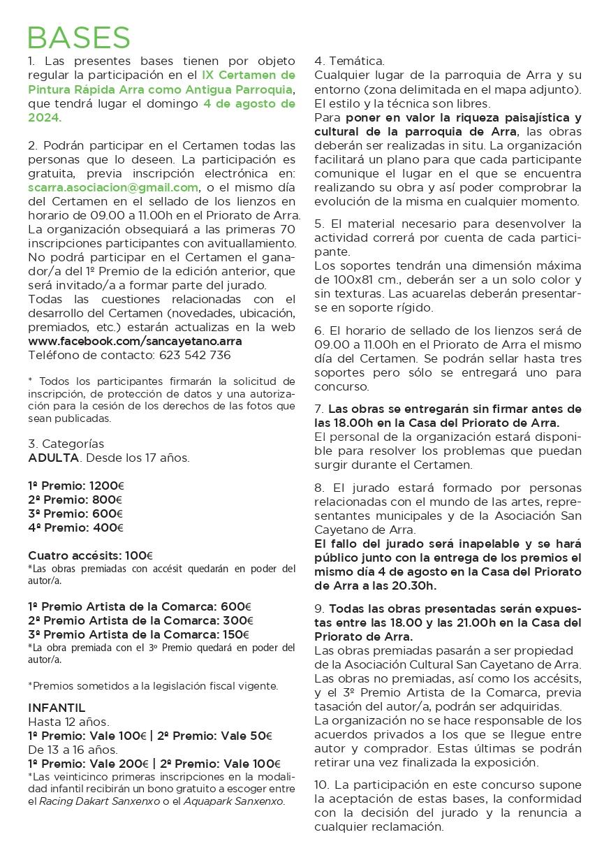 - Las presentes bases tienen por objeto regular la participación en el IX Certamen de Pintura Rápida Arra como Antigua Parroquia, que tendrá lugar el domingo 4 de agosto de 2024.