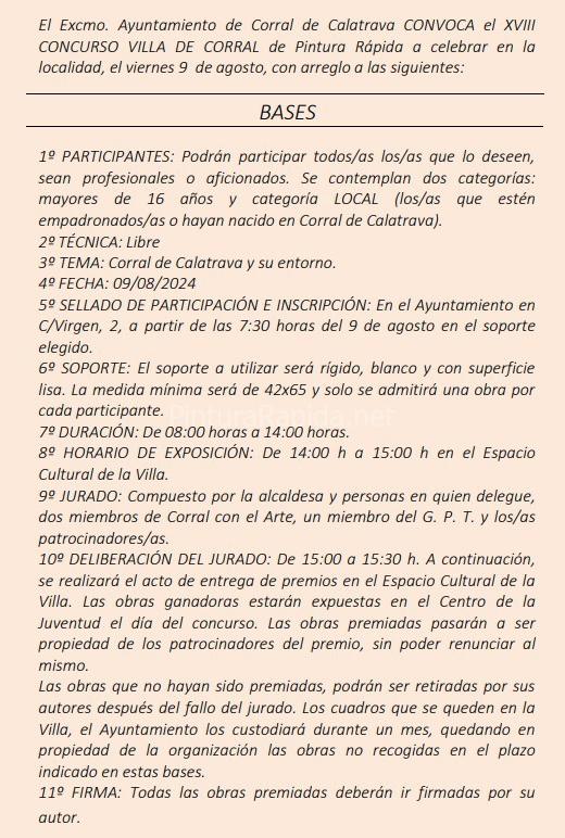 El Excmo. Ayuntamiento de Corral de Calatrava CONVOCA el XVIII CONCURSO VILLA DE CORRAL de Pintura Rápida a celebrar en la localidad el viernes 9 de agosto, con arreglo a las siguientes: