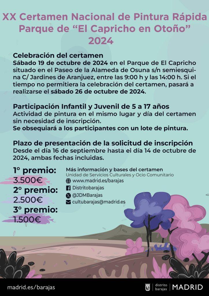 Con la finalidad de promover la cultura a través de los valores pictóricos en el marco incomparable del Parque del Capricho se convoca la decimonovena edición de estos premios de pintura rápida, que tendrá lugar el 19 de octubre de 2024.