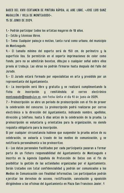 6.- La inscripción será libre y gratuita y se realizará cumplimentando la ficha de inscripción y remitiéndola al correo electrónico monteagudo@masbytes.es. con fecha limite el día 10 de junio de 2024. 7.- Preinscripción: se abre un periodo de preinscripción con el fin de prever la celebración del concurso. La preinscripción podrá realizarse por correo electrónico a la dirección del Ayuntamiento, indicando nombre, apellidos, dirección y teléfono, hasta 5 días antes de la celebración de la prueba. La preinscripción es voluntaria y orientativa para la organización, no siendo requisito obligatorio para la inscripción.