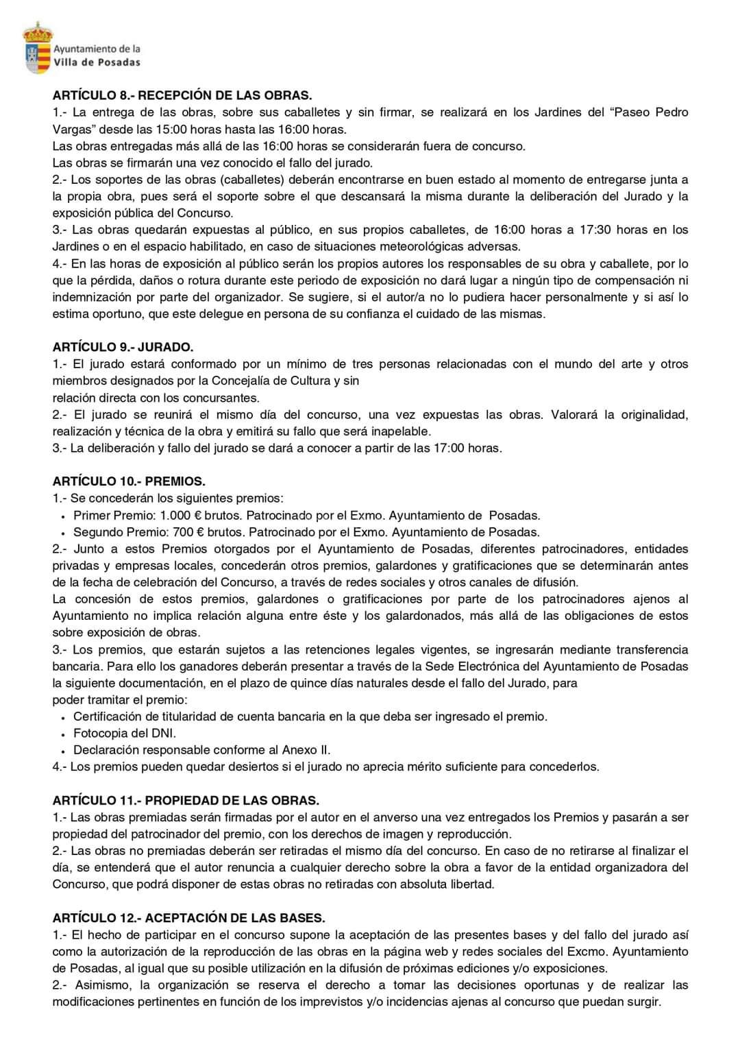 - El hecho de participar en el concurso supone la aceptación de las presentes bases y del fallo del jurado, así como la autorización de reproducción de las obras en la página web y redes sociales del Excmo. Ayuntamiento de Posadas, al igual que su posible utilización en dípticos y carteles de ediciones y exposiciones posteriores.