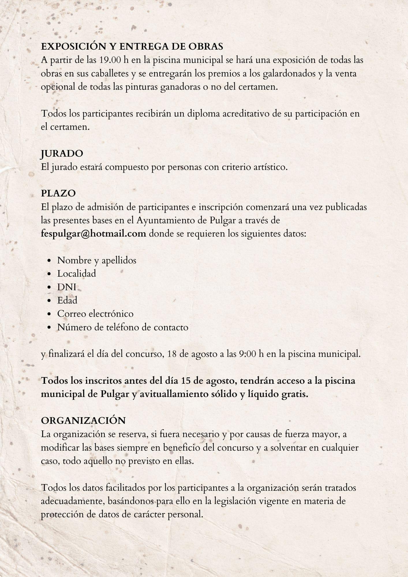 El plazo de admisión de participantes e inscripción comenzará una vez publicadas las presentes bases en el Ayuntamiento de Pulgar a través de fespulgar@hotmail.com donde se requieren los siguientes datos: - Nombre y apellidos