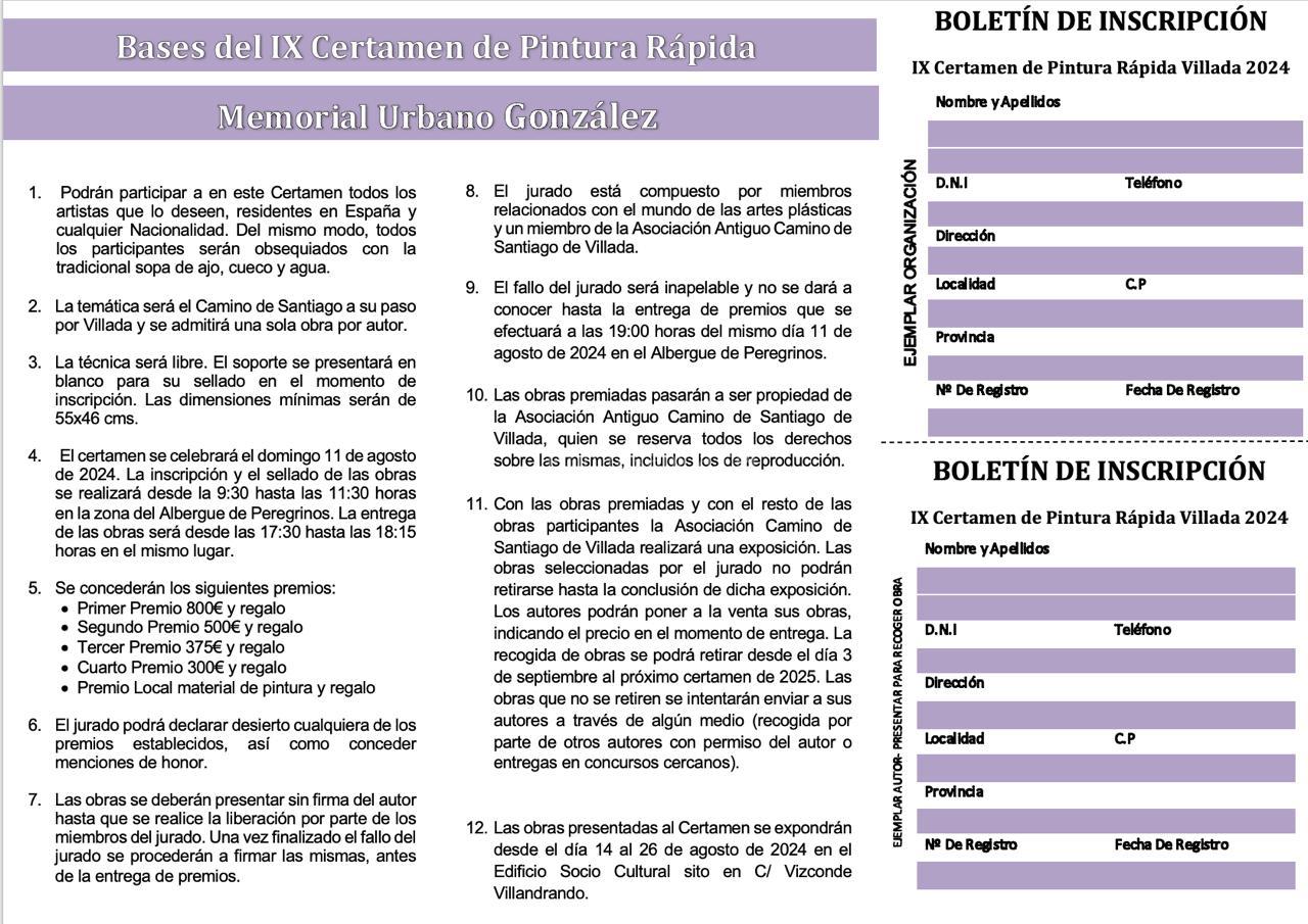 - Las obras premiadas pasarán a ser propiedad de la Asociación Antiguo Camino de Santiago de Villada, quien se reserva todos los derechos sobre las mismas, incluidos los de reproducción.