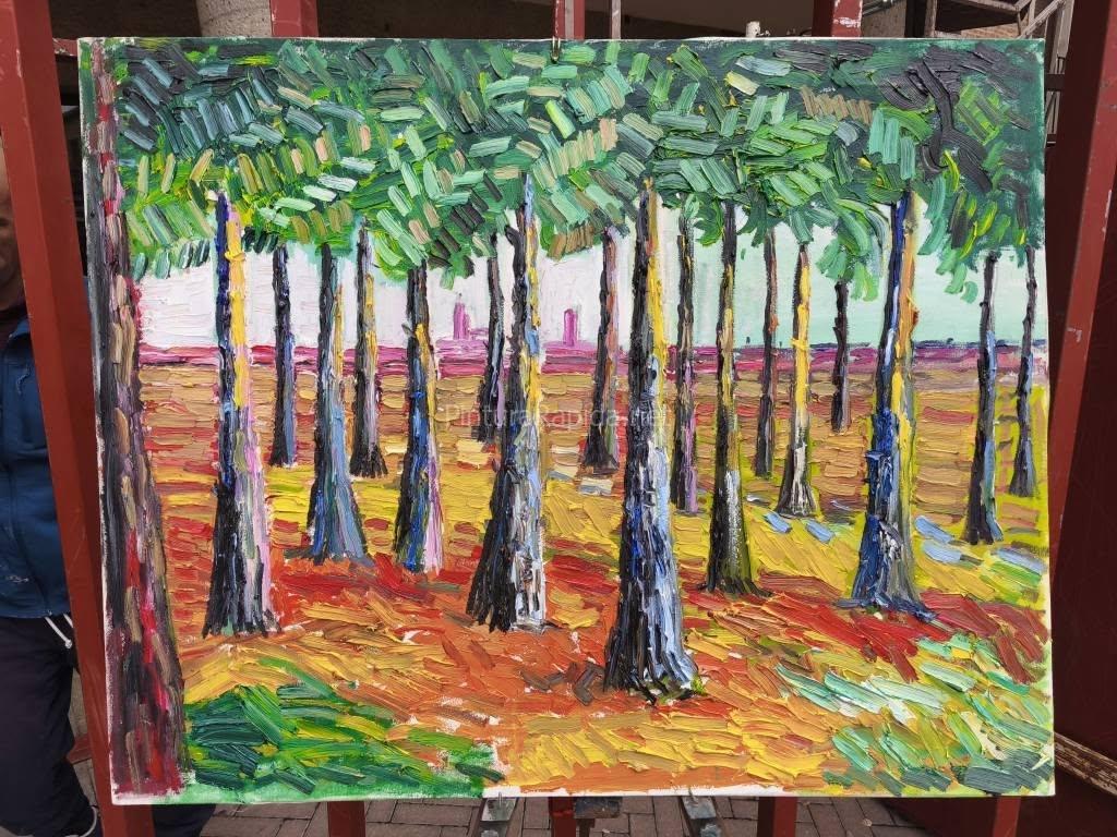 En segunda posición se situó Beni Rodríguez, con una pieza que capturó un camino rural flanqueado por campos verdes y tejados a lo lejos, evocando la conexión entre el pueblo y su entorno agrícola. El tercer premio fue para Pablo Sevillano, quien apostó por una vibrante escena vegetal con árboles y sombras en primer plano, combinando soltura y frescura en cada pincelada.