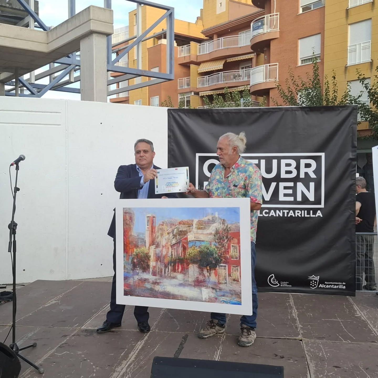 El pintor Alfredo López ha sido galardonado con el Premio Ayuntamiento de Alcantarilla, dotado con 1.100 euros, en el concurso de pintura rápida celebrado recientemente en la localidad murciana. En la imagen captada tras la entrega de premios, aparece posando junto a su obra ganadora: una luminosa y precisa acuarela urbana que representa la fachada del Ayuntamiento de Alcantarilla y su entorno, capturando con maestría la arquitectura, la perspectiva y la atmósfera de la escena.