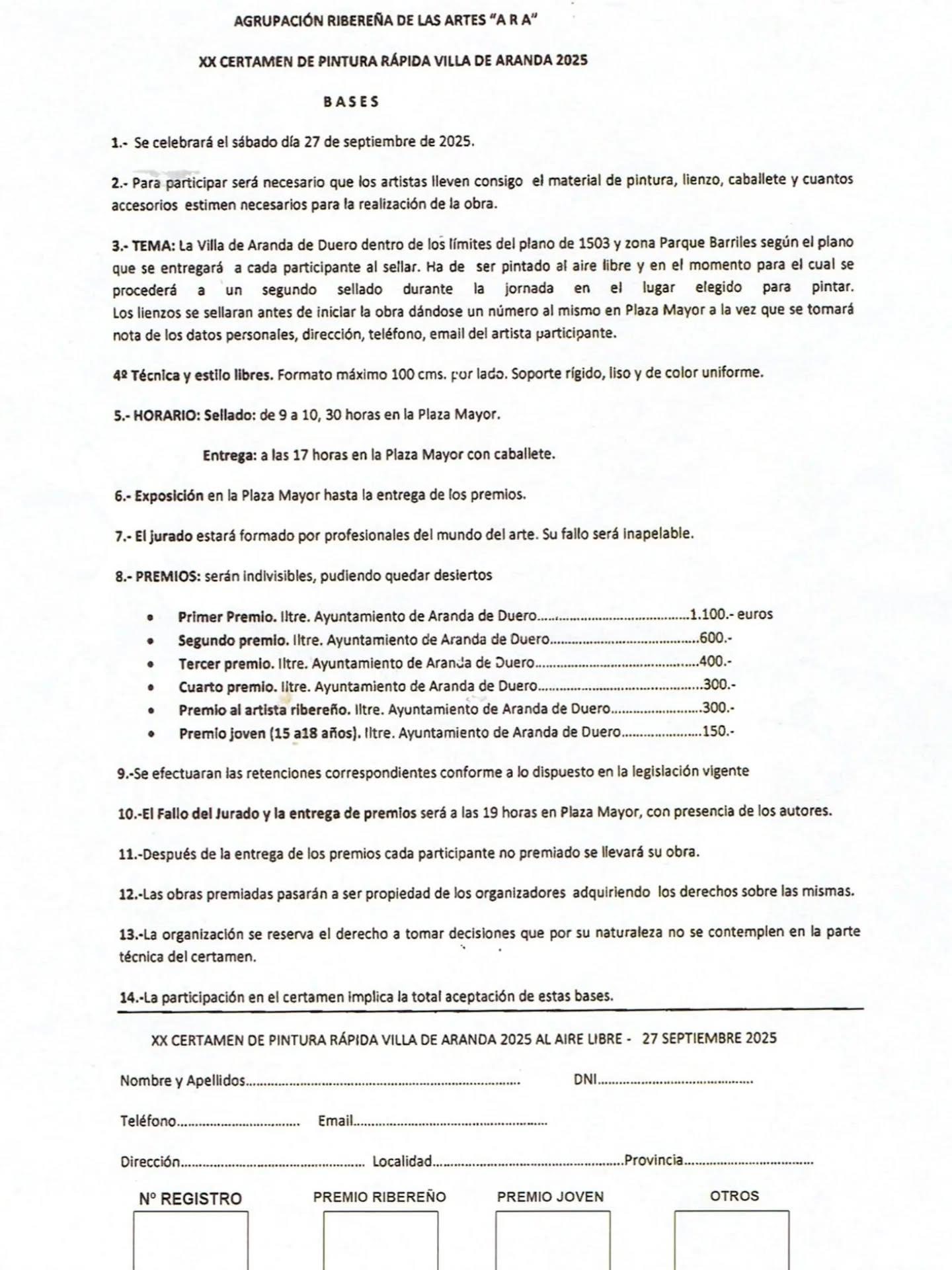 Tema: La Villa de Aranda de Duero dentro de los límites del plano de 1503 y zona Parque Barriles, según el plano que se entregará a cada participante al sellar. Ha de ser pintado al aire libre y en el momento para el cual se procederá a un segundo sellado durante la jornada en el lugar elegido para pintar. Los lienzos se sellarán antes de iniciar la obra dándose un número al mismo en Plaza Mayor; a la vez se tomarán los datos personales, dirección, teléfono y correo electrónico del artista participante.