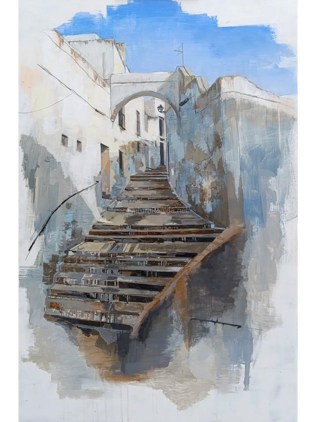 El Segundo Premio fue para David García Poncel, que presentó una sugerente interpretación de una escalinata encalada, con un tratamiento moderno y expresivo de las texturas y los volúmenes, bajo un cielo azul intenso. Su obra destacó por la fuerza compositiva y la interpretación libre del entorno urbano.