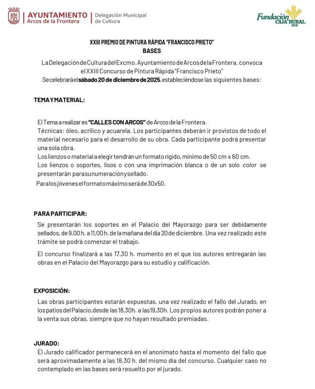 La Delegación de Cultura del Ayuntamiento de Arcos de la Frontera ha convocado el XXIII Concurso de Pintura Rápida ‘Francisco Prieto’, que se celebrará el sábado 20 de diciembre de 2025. La cita artística establece como tema principal “Calles con Arcos”, invitando a los participantes a reflejar en sus obras los rincones y paisajes del municipio.