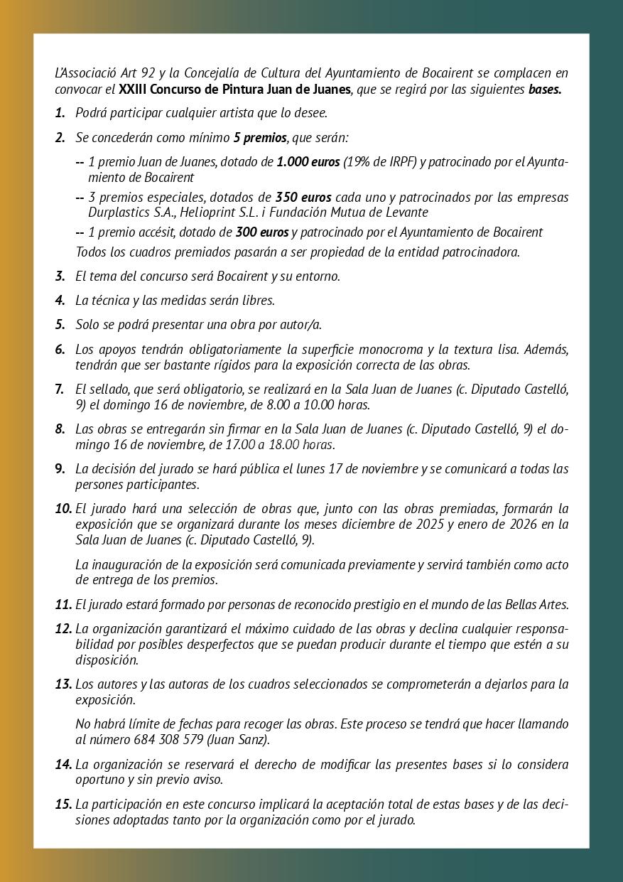 L’Associació Art 92 y la Concejalía de Cultura del Ayuntamiento de Bocairent se complacen en convocar el XXIII Concurso de Pintura Juan de Juanes, que se regirá por las siguientes bases.
