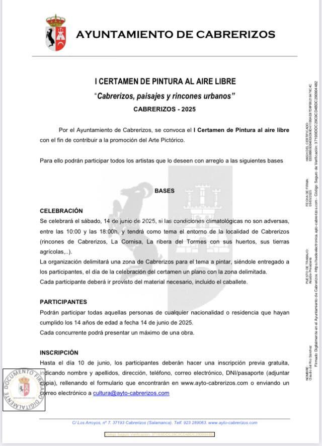 Por el Ayuntamiento de Cabrerizos, se convoca el I certamen de pintura al aire libre con el fin de contribuir a la promoción del arte pictórico.