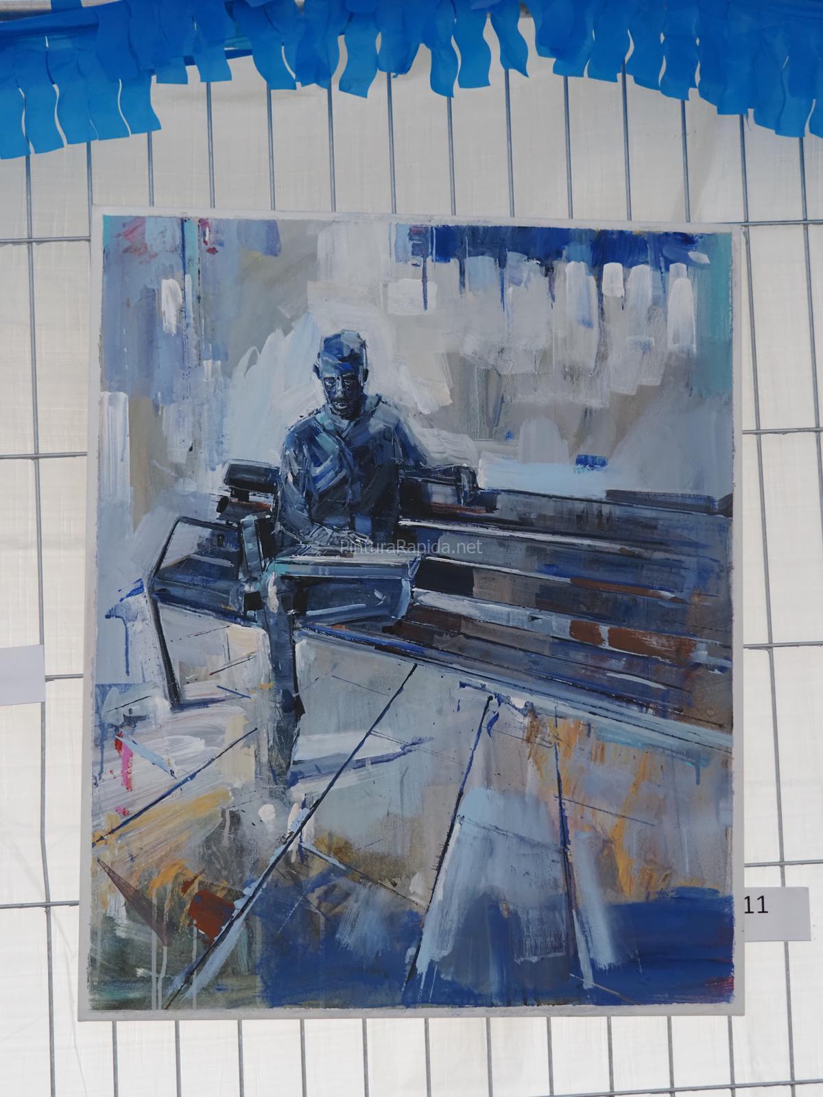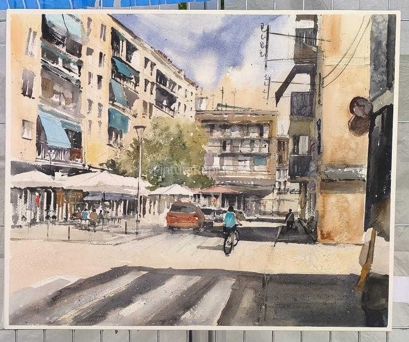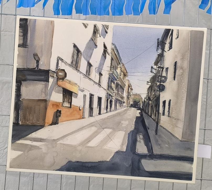 El segundo premio, con una dotación de 400 euros, fue para Abel Florido, que presentó una luminosa escena de calle, donde una figura en bicicleta avanza entre edificios, terrazas y sombras marcadas por la luz del sol. La obra destacó por su dominio del espacio y atmósfera urbana.