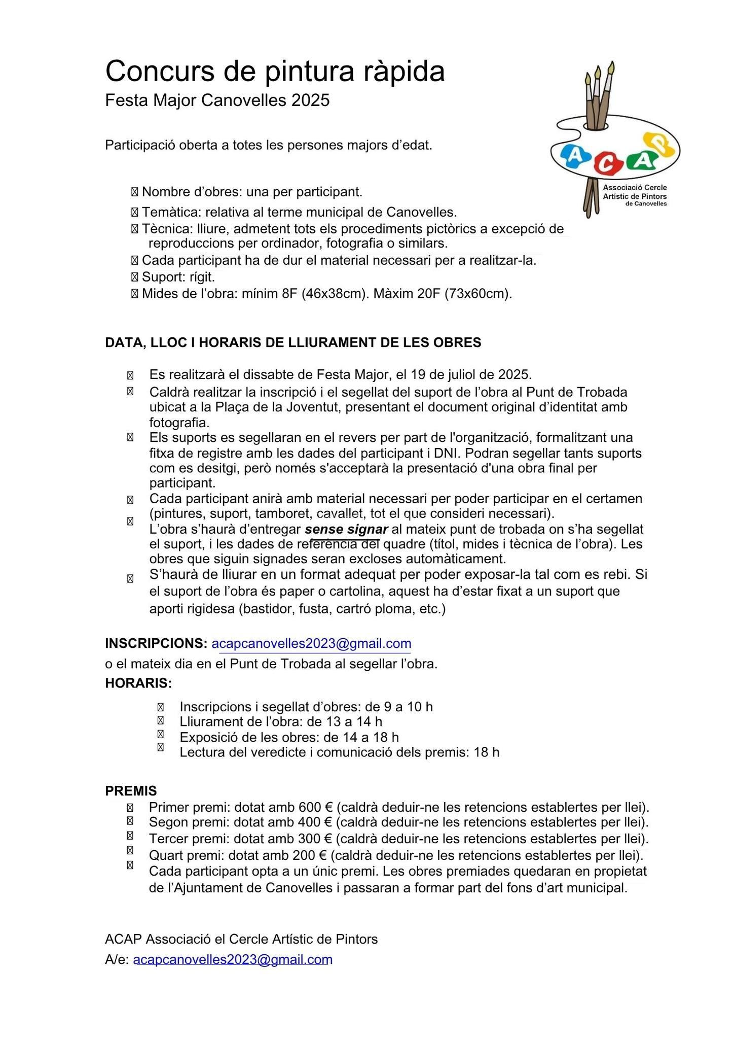 acapcanovelles2023@gmail.com o el mismo día en el punto de encuentro