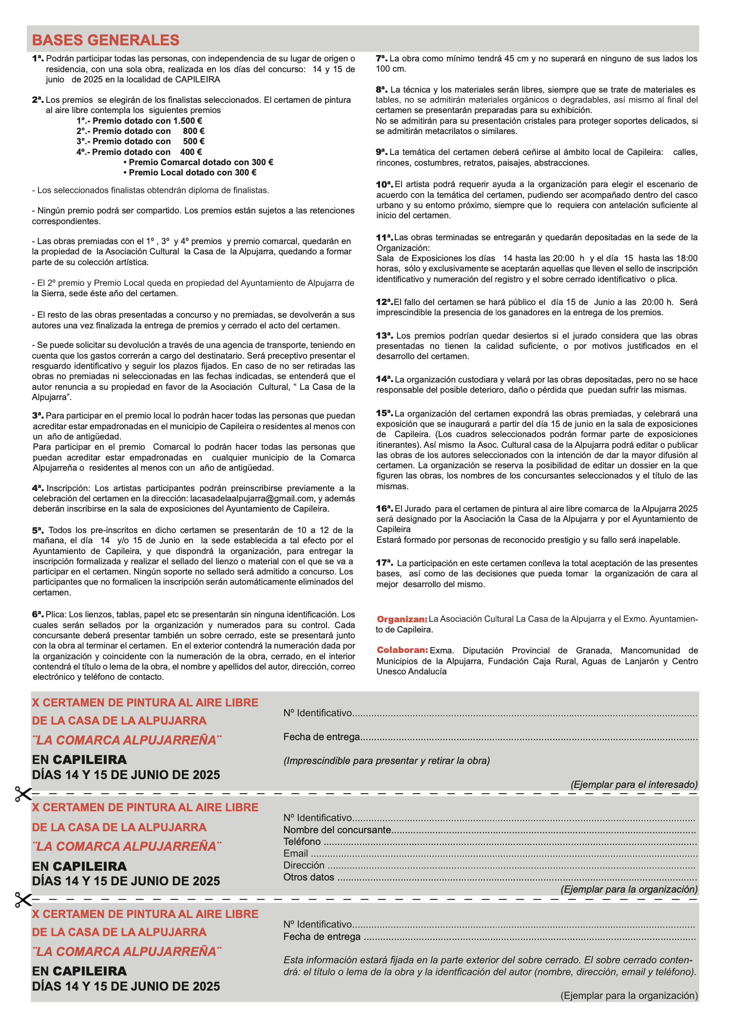 16ª. El jurado para el certamen de pintura al aire libre comarca de la Alpujarra 2025 será designado por la Asociación La Casa de la Alpujarra y por el Ayuntamiento de Capileira. Estará formado por personas de reconocido prestigio y su fallo será inapelable.