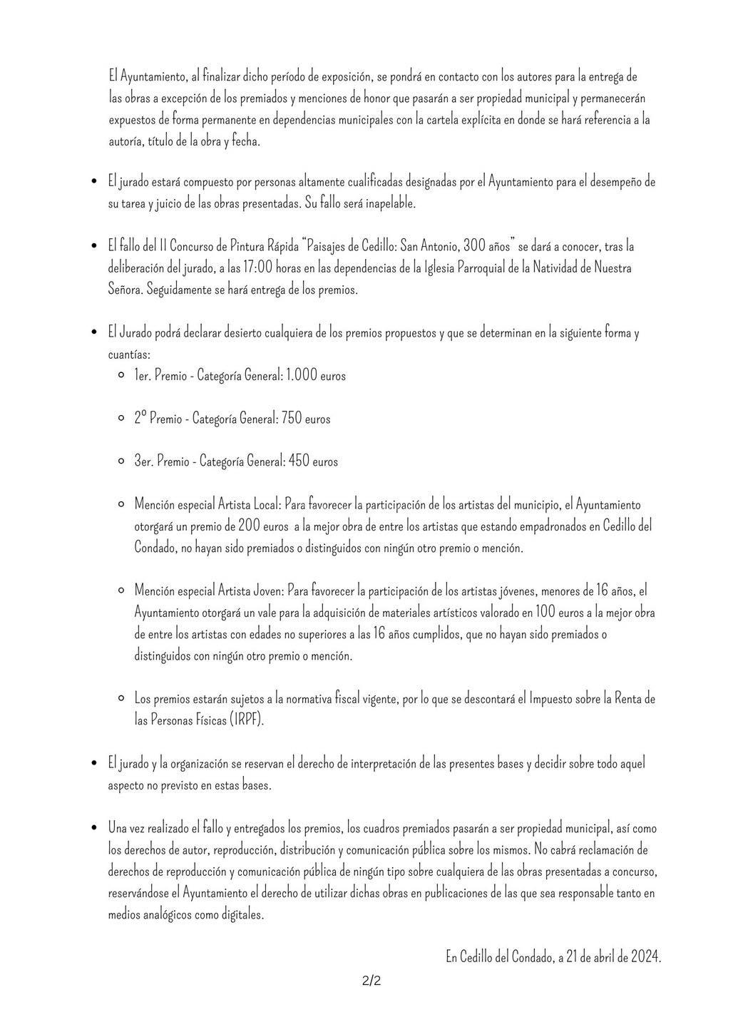 Mención especial Artista Local: para favorecer la participación de los artistas del municipio, el Ayuntamiento otorgará un premio de 200 euros a la mejor obra de entre los artistas que estén empadronados en Cedillo del Condado, no hayan sido premiados o distinguidos con ningún otro premio o mención.