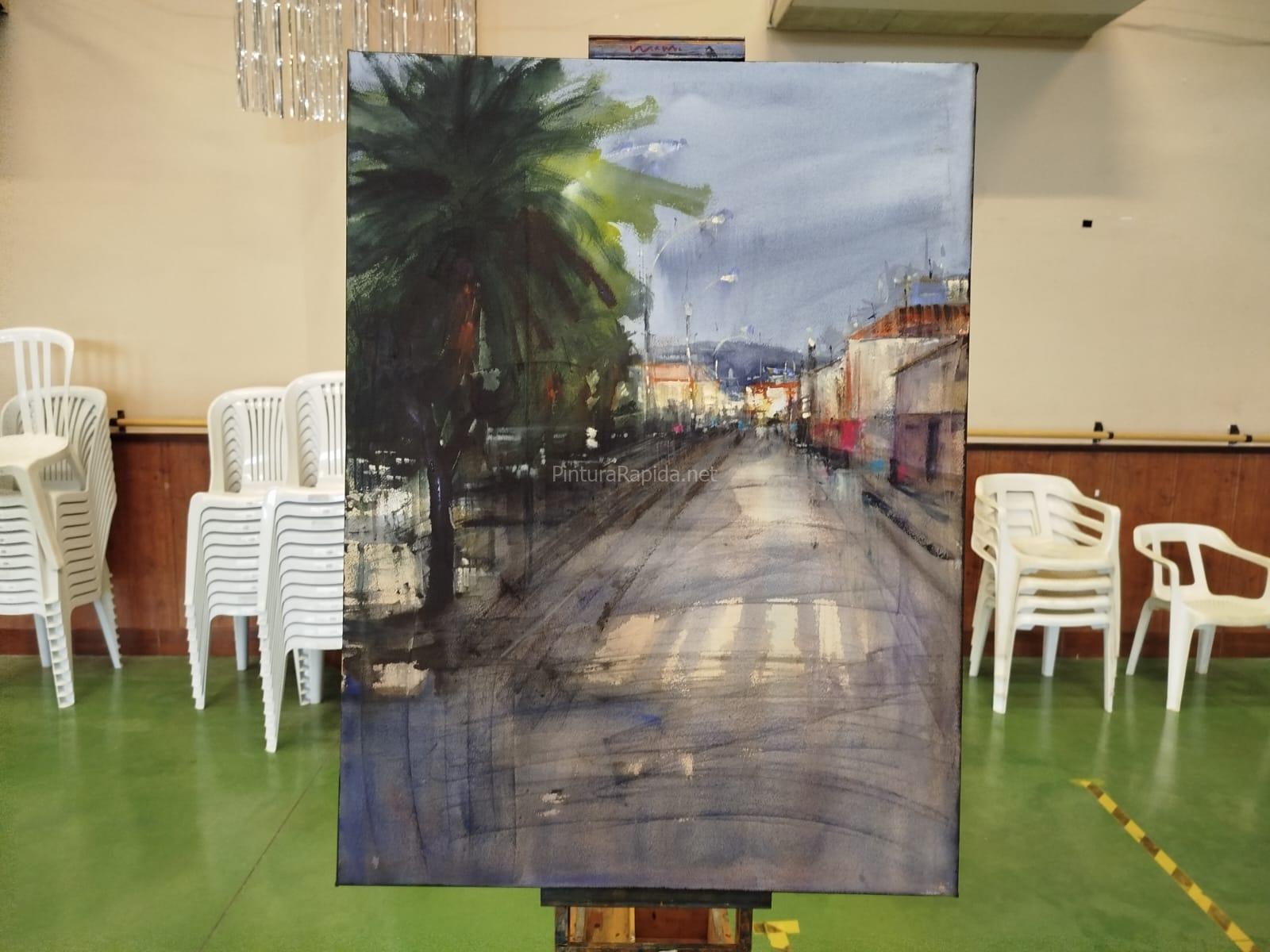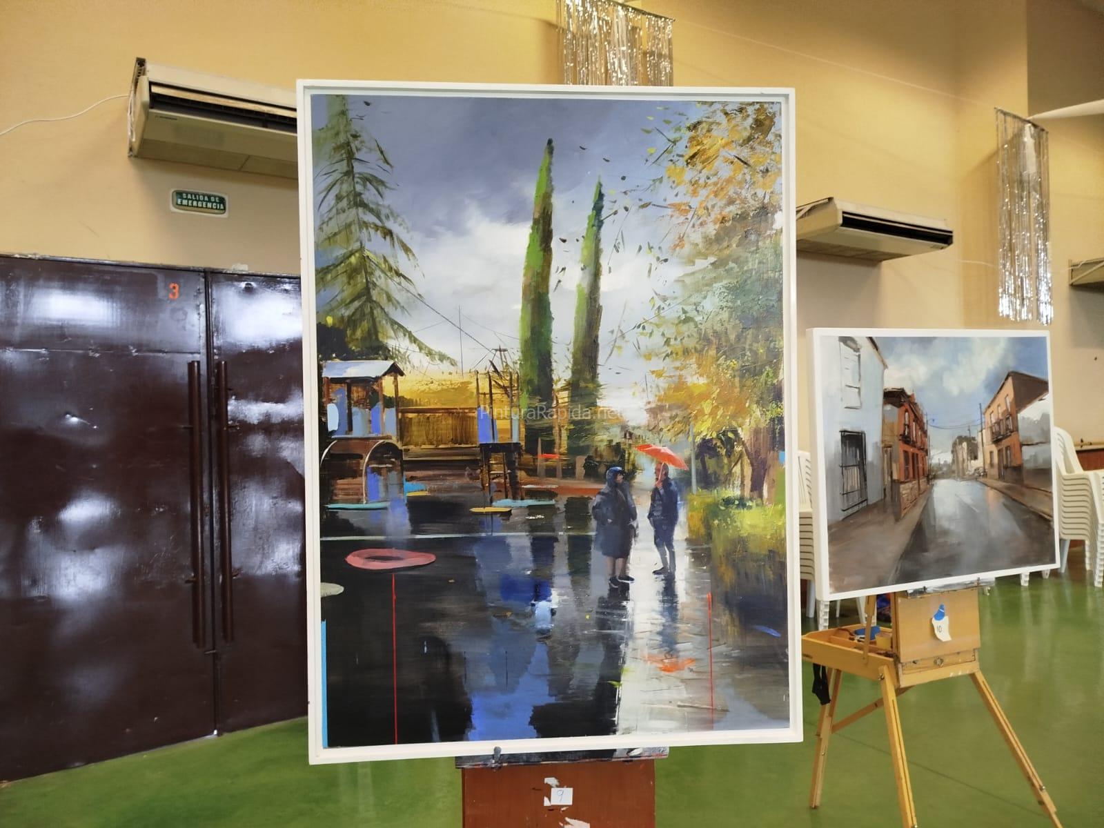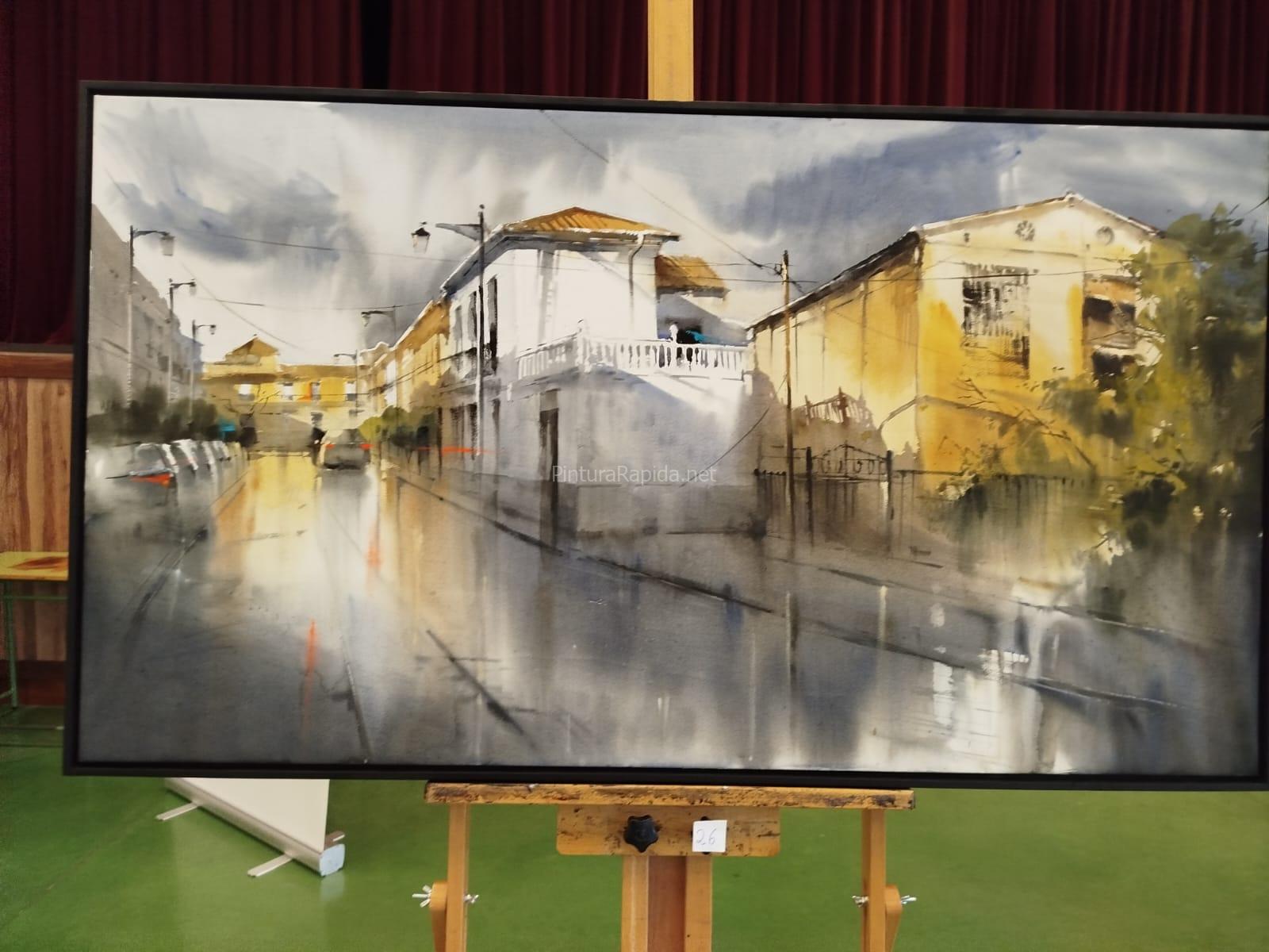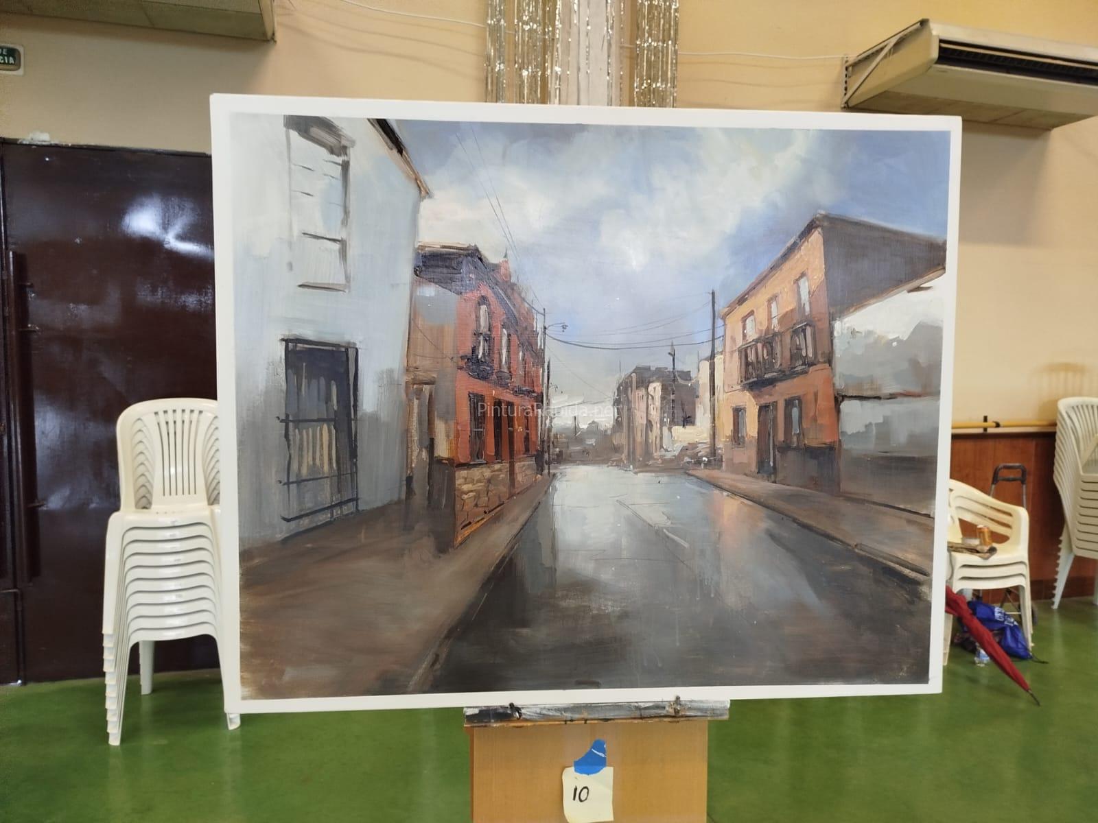 El segundo premio ha sido para Adrián Marmolejo, cuyo cuadro recrea una calle mojada por la lluvia, con fachadas iluminadas y un ambiente atmosférico muy marcado. Las transparencias, los reflejos y la suavidad de los degradados aportan una gran sensibilidad a la escena urbana.