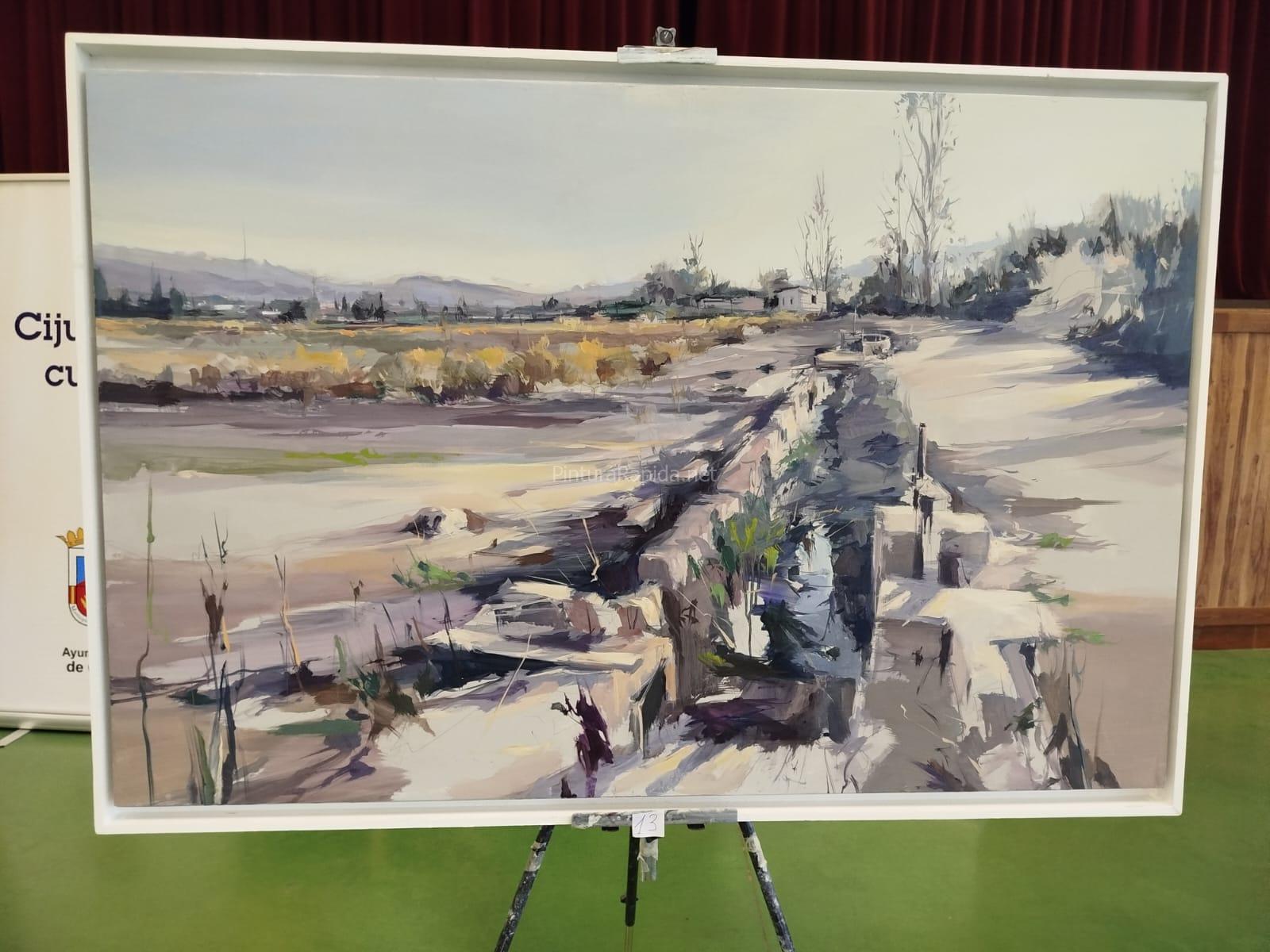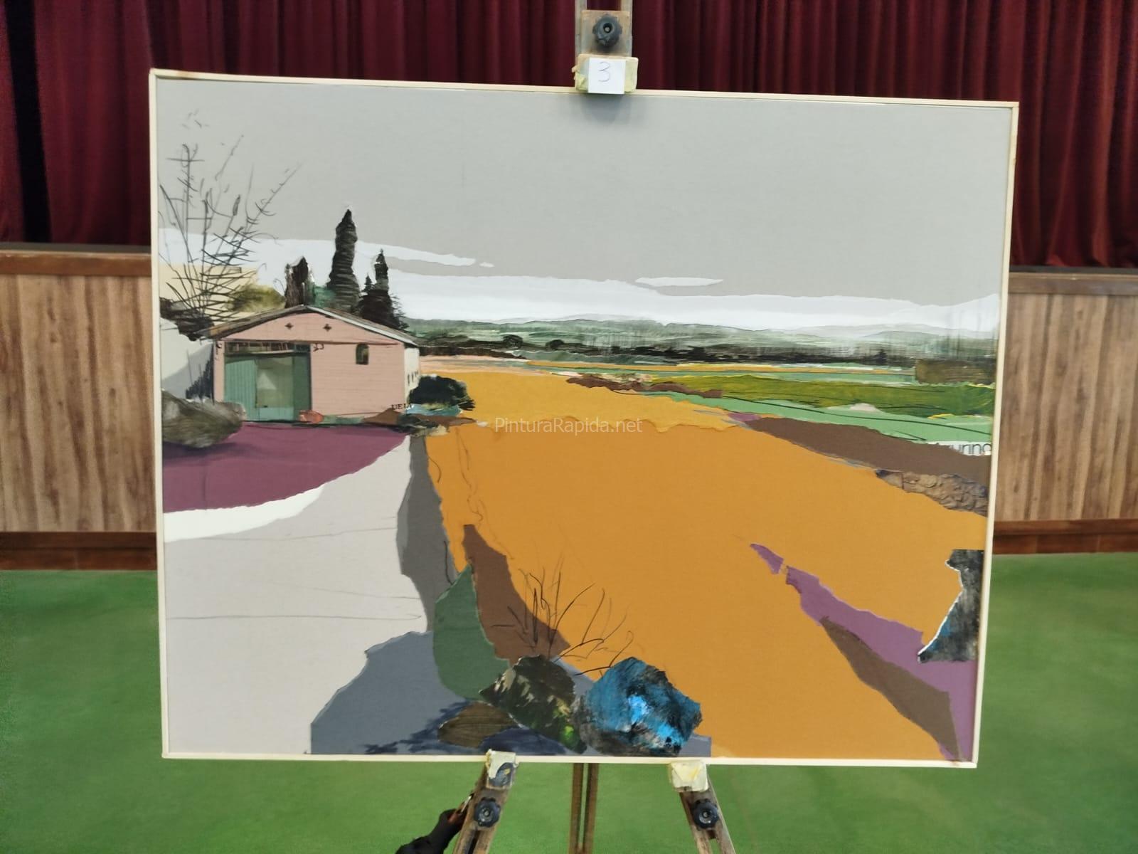 El primer premio, firmado por Jaime Jurado, presenta un amplio paisaje abierto de carácter contemporáneo, donde las manchas expresivas y las transiciones cromáticas construyen un horizonte rural dinámico y vibrante. La pieza destaca por su composición amplia y por la riqueza de texturas que recorren el terreno representado.