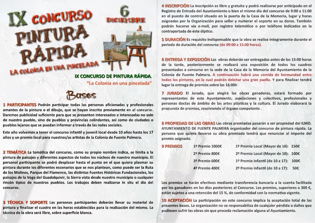 Las obras premiadas pasarán a ser propiedad del Ilmo. Ayuntamiento de Fuente Palmera, organizador del concurso de pintura rápida. La persona que quisiera llevarse su obra premiada tendrá una opción de recompra fijada en el premio asignado.