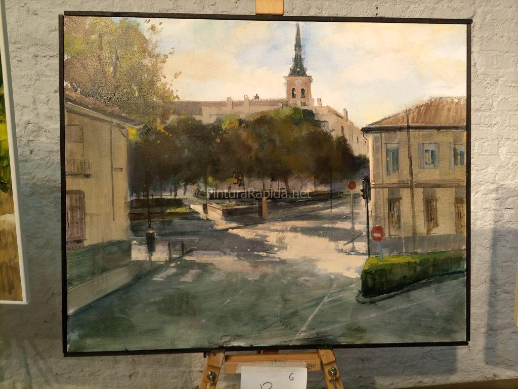 En la imagen, el cuadro ganador de Juan Antonio Piedrahita García muestra una vista urbana de Getafe con la iglesia al fondo, un trabajo en el que destacan los contrastes lumínicos y el equilibrio arquitectónico de la escena.