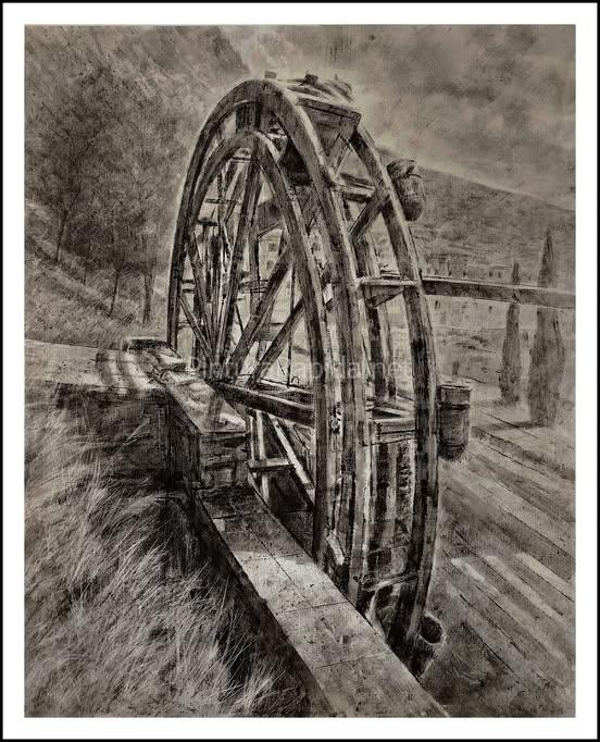 Emiliano Vozmediano López conquista Güéjar Sierra con su ‘Noria de agua’ en el Certamen de Pintura Rápida al Aire Libre