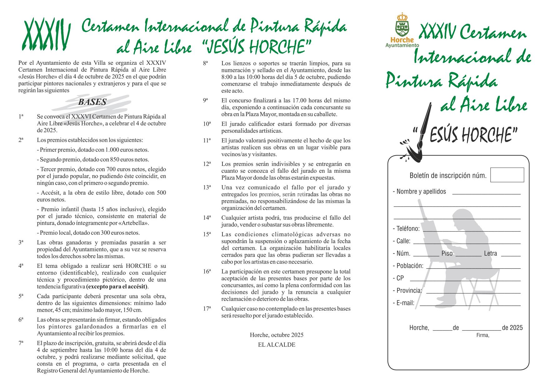 1ª. Se convoca el XXXIV Certamen de Pintura Rápida al Aire Libre «Jesús Horche», a celebrar el 4 de octubre de 2025.
