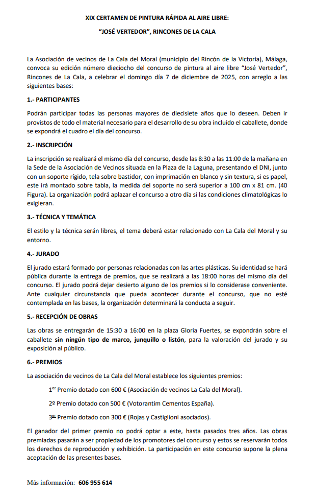 La Asociación de Vecinos de La Cala del Moral (municipio del Rincón de la Victoria), Málaga, convoca su edición número diecinueve del concurso de pintura al aire libre «José Vertedor», rincones de La Cala, a celebrar el domingo día 7 de diciembre de 2025, con arreglo a las siguientes bases: