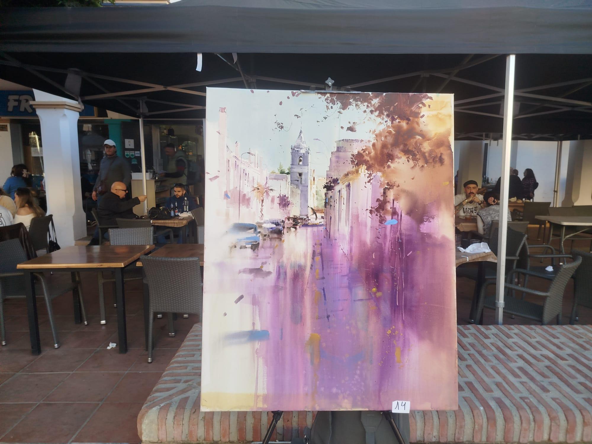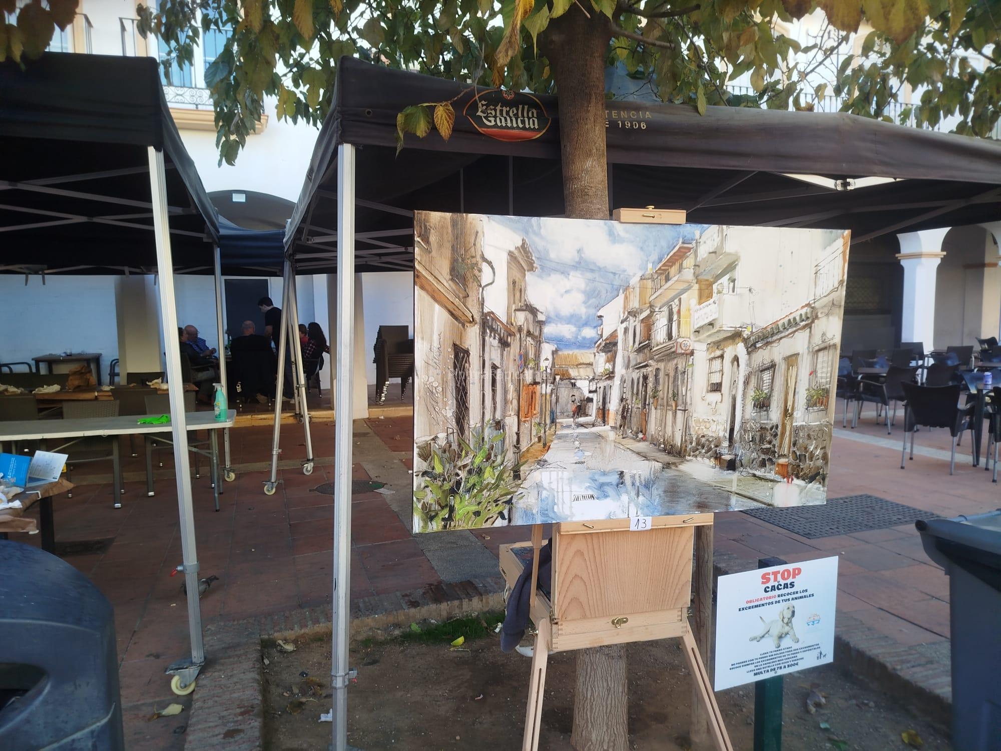 El primer premio, dotado con 600 euros, ha recaído en Miguel Linares Ríos, quien presentó una obra de notable realismo y profundidad, capturando una calle del casco antiguo con reflejos en el suelo tras la lluvia, jugando magistralmente con la luz y la perspectiva. El cuadro, ubicado en pleno centro de la plaza, atrajo numerosas miradas antes de conocerse el fallo del jurado.
