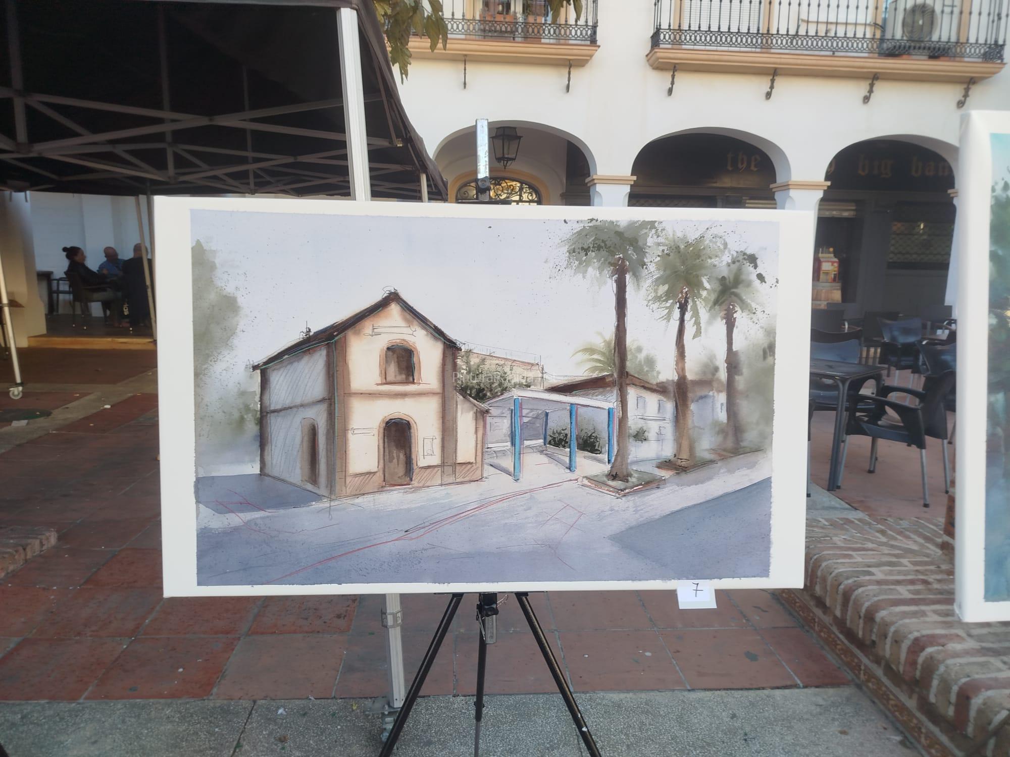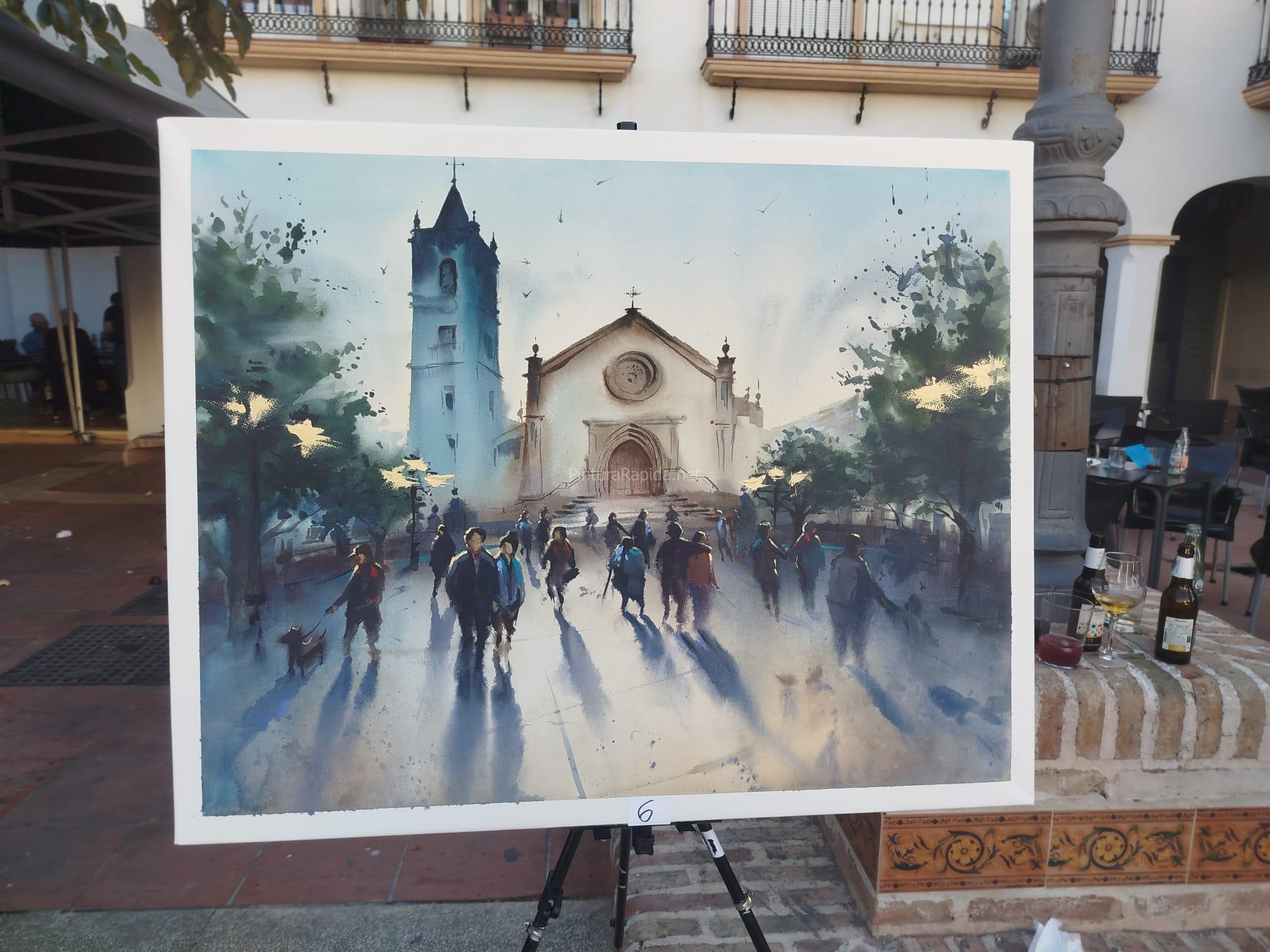 Daniel Lavado Pérez, segundo premio, presentó una obra de fuerte impacto visual, con una escena de arquitectura en ruinas marcada por grafitis y vegetación desbordada, donde destacan las texturas densas y los contrastes cromáticos. Alejandro Pérez Murillo, tercer premio, ofreció una acuarela de gran delicadeza en la que representa la plaza de la iglesia con figuras en movimiento y una atmósfera luminosa que capta la esencia del lugar con sensibilidad y fluidez.