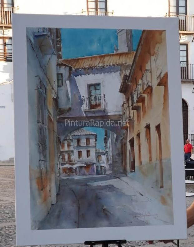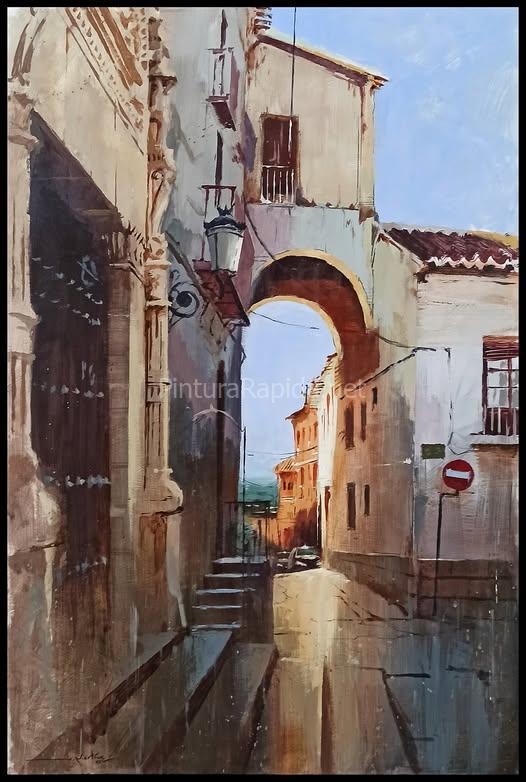 La jornada concluyó con el reconocimiento a Javier Martín Aranda, quien obtuvo el primer premio, dotado con 1.000 euros y diploma. Su obra, una escena urbana de luz rasante y arquitectura monumental, destacó por su maestría en el tratamiento de la perspectiva y la atmósfera del lugar, capturando con precisión una calle estrecha bajo un arco característico, donde la luz y la sombra juegan un papel protagonista.
