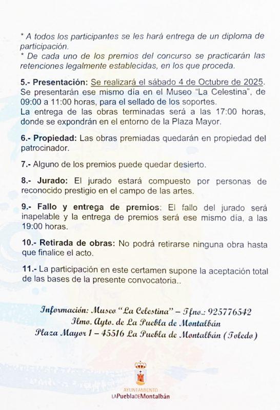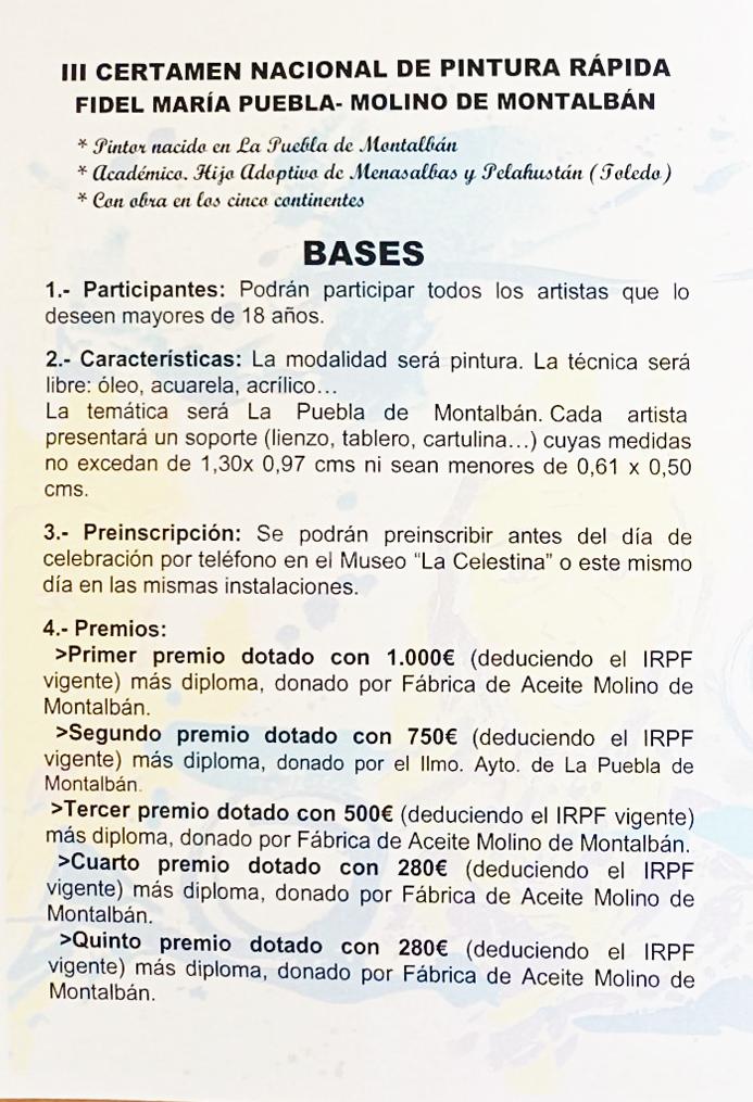 La temática será La Puebla de Montalbán. Cada artista presentará un soporte (lienzo, tablero, cartulina…) cuyas medidas no excedan de 1,30 x 0,97 cm ni sean menores de 0,61 x 0,50 cm.Preinscripción: Se podrá preinscribir antes del día de celebración por teléfono en el Museo “La Celestina” o ese mismo día en las mismas instalaciones.