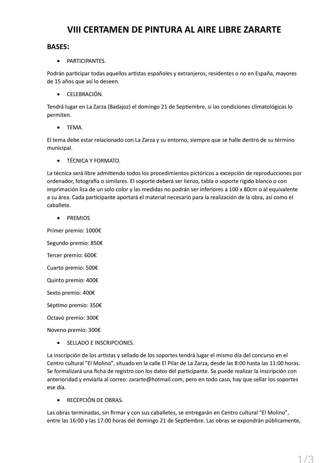 Se formalizará una ficha de registro con los datos del participante. También se puede realizar inscripción previa enviando los datos a: zararte@hotmail.com