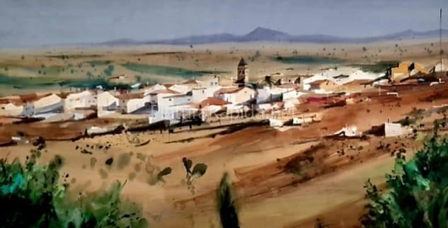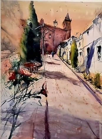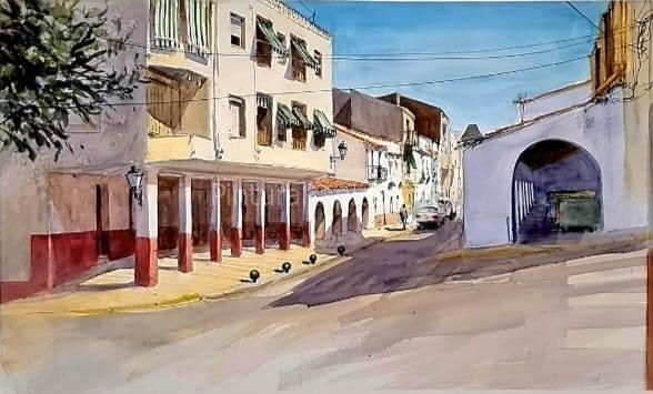 El primer premio, dotado con 1.000 euros, fue para Gustavo Hernández Puertas, quien presentó una acuarela de gran belleza técnica y sensibilidad. Su obra, con una cálida luz del atardecer y una composición que conduce la mirada hasta la iglesia al fondo, conquistó al jurado por su dominio del color y su atmósfera evocadora.