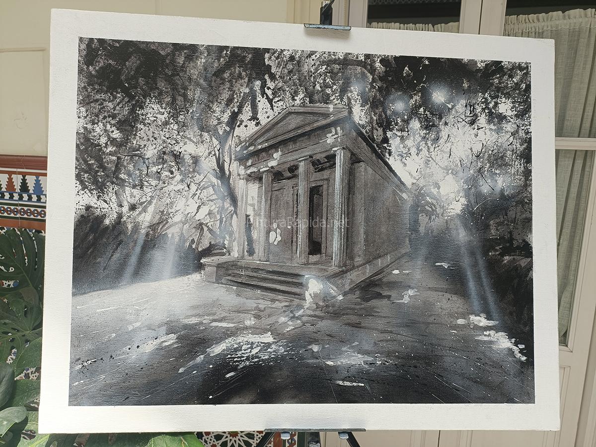 El tercer lugar fue para Paco Rojas, que presentó una obra impactante en blanco y negro, destacando el dramatismo del templo neoclásico del jardín envuelto en una atmósfera de luz tamizada y misterio, una propuesta arriesgada que cautivó al jurado por su originalidad.