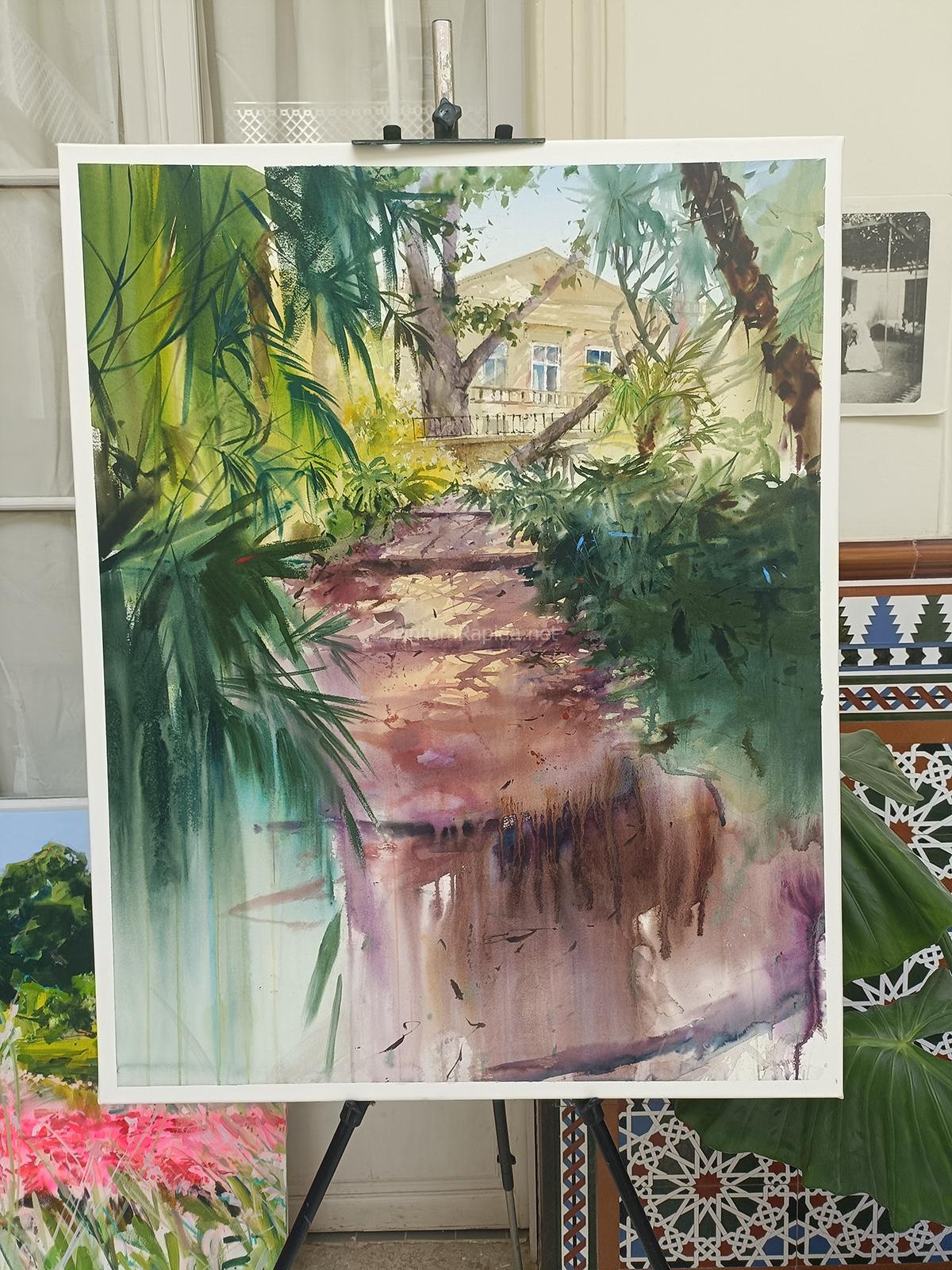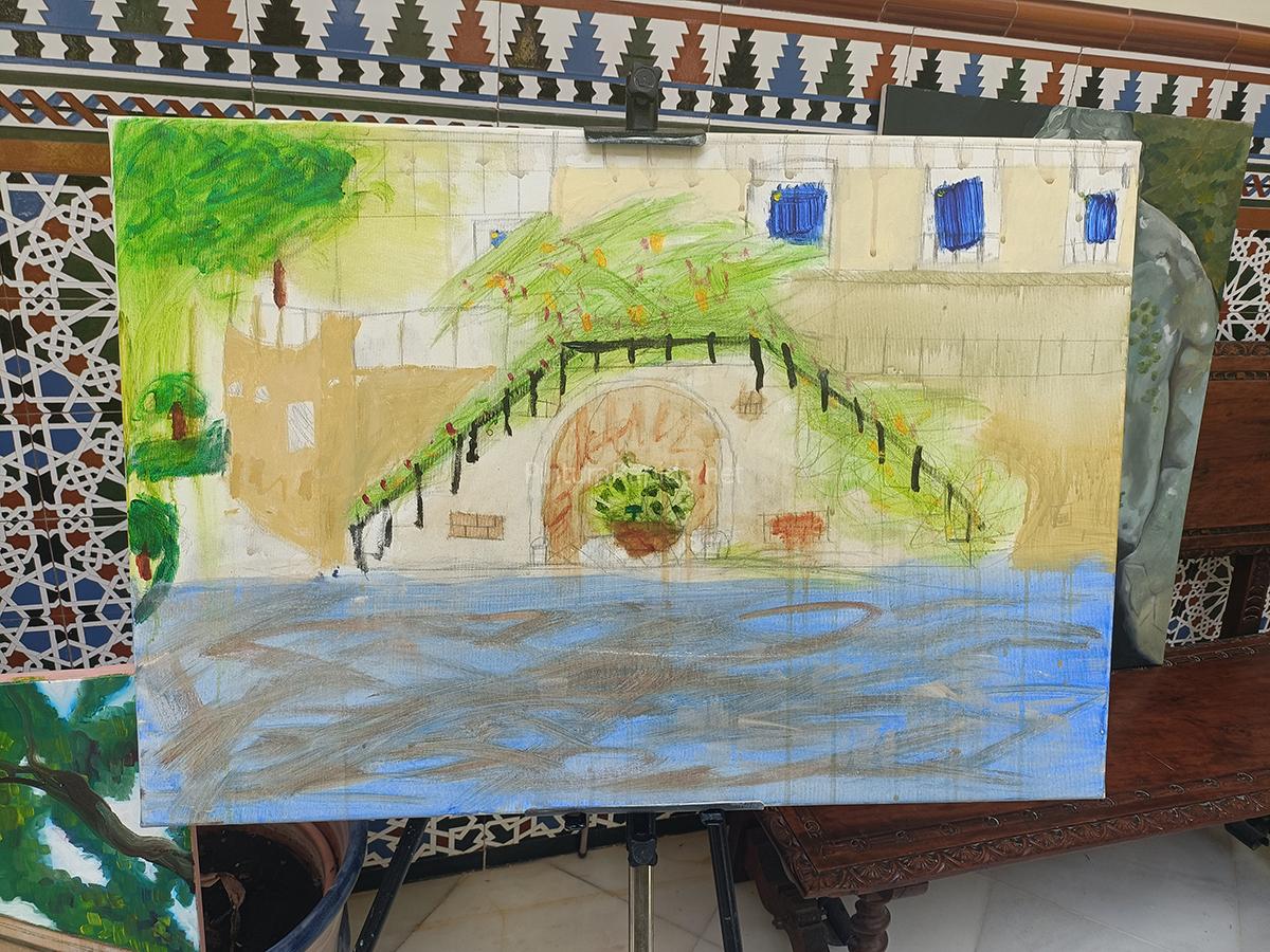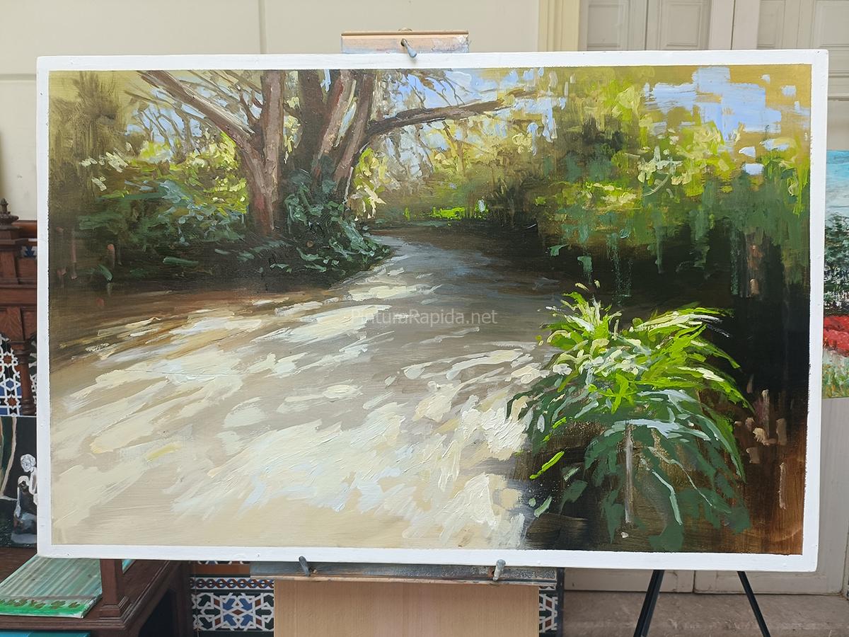 El primer premio fue para Juan Miguel Álvarez Páez, cuya obra se alzó con la victoria por su magnífica recreación de una vista panorámica donde la aridez del terreno se funde magistralmente con las sombras proyectadas por altos cipreses y pinos. Un paisaje equilibrado y lleno de profundidad, ejecutado con técnica impecable y sensibilidad cromática, que atrapó la esencia del jardín malagueño con maestría.