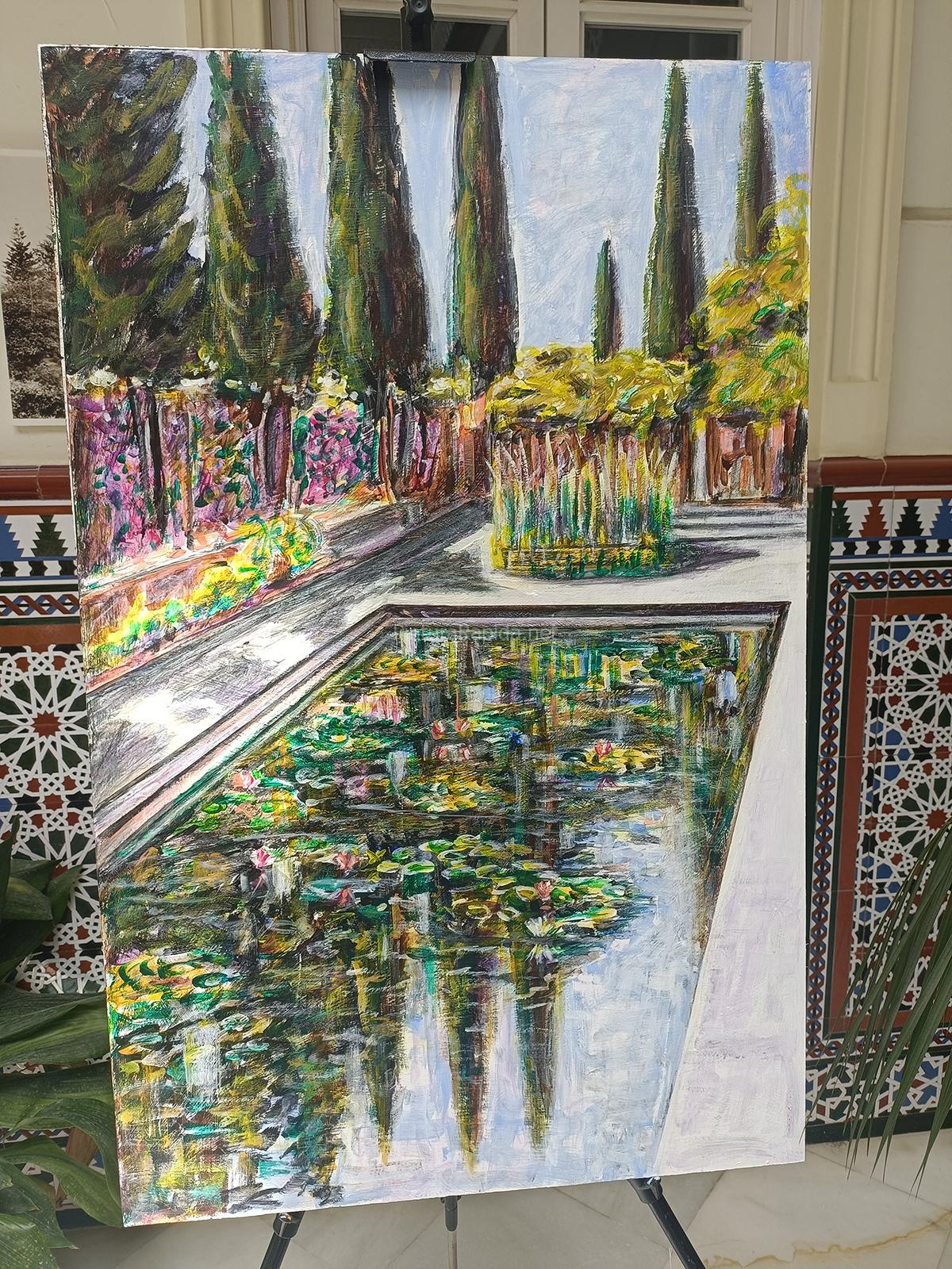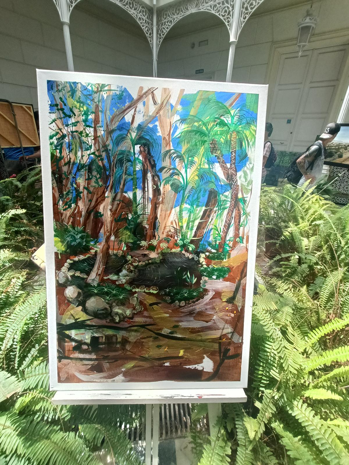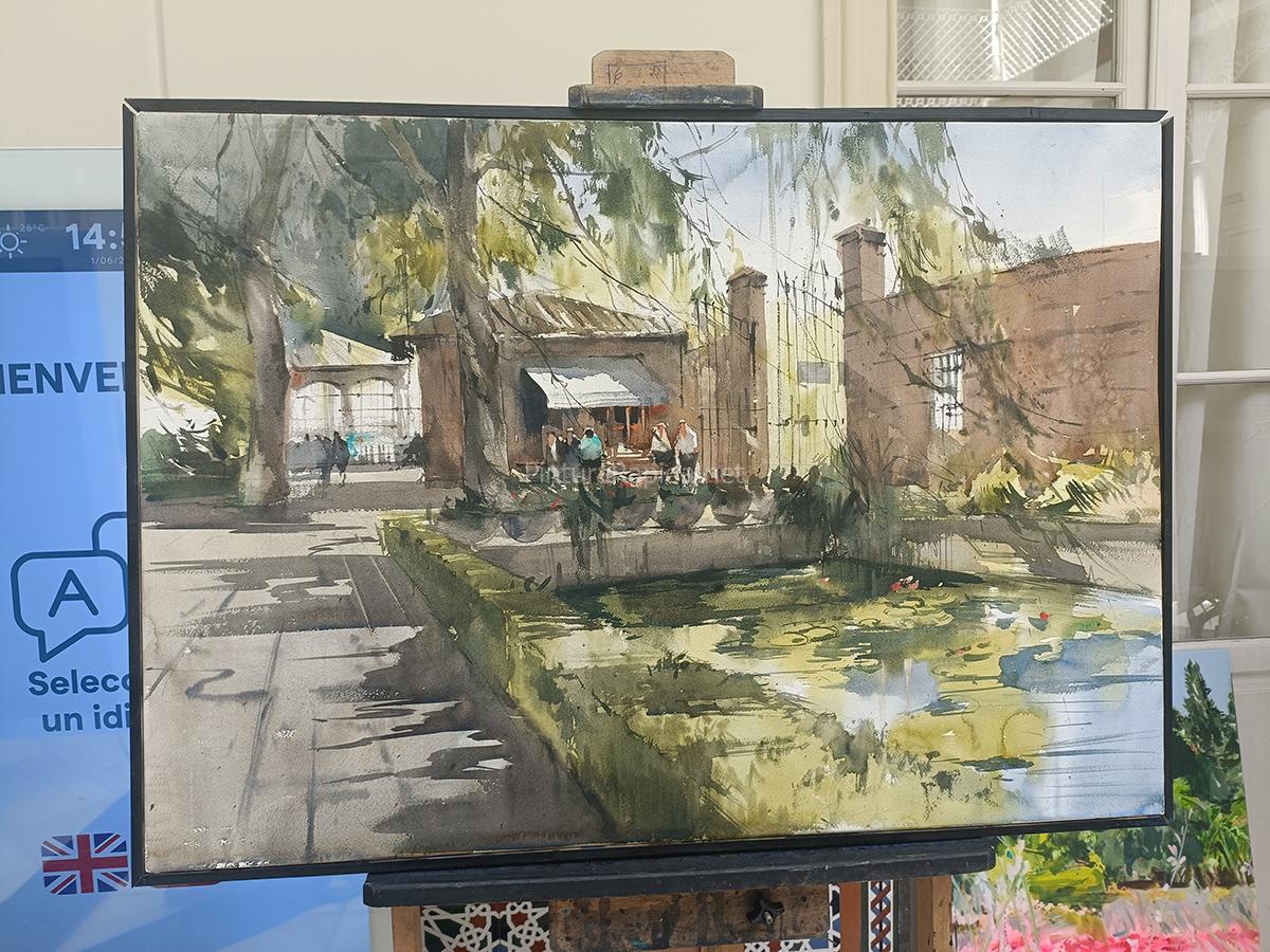 El segundo puesto fue para Adrián Marmolejo, quien apostó por una escena más cotidiana pero igualmente vibrante: un rincón junto al estanque con reflejos y figuras humanas en movimiento, con una ejecución suelta, luminosa y llena de vida.