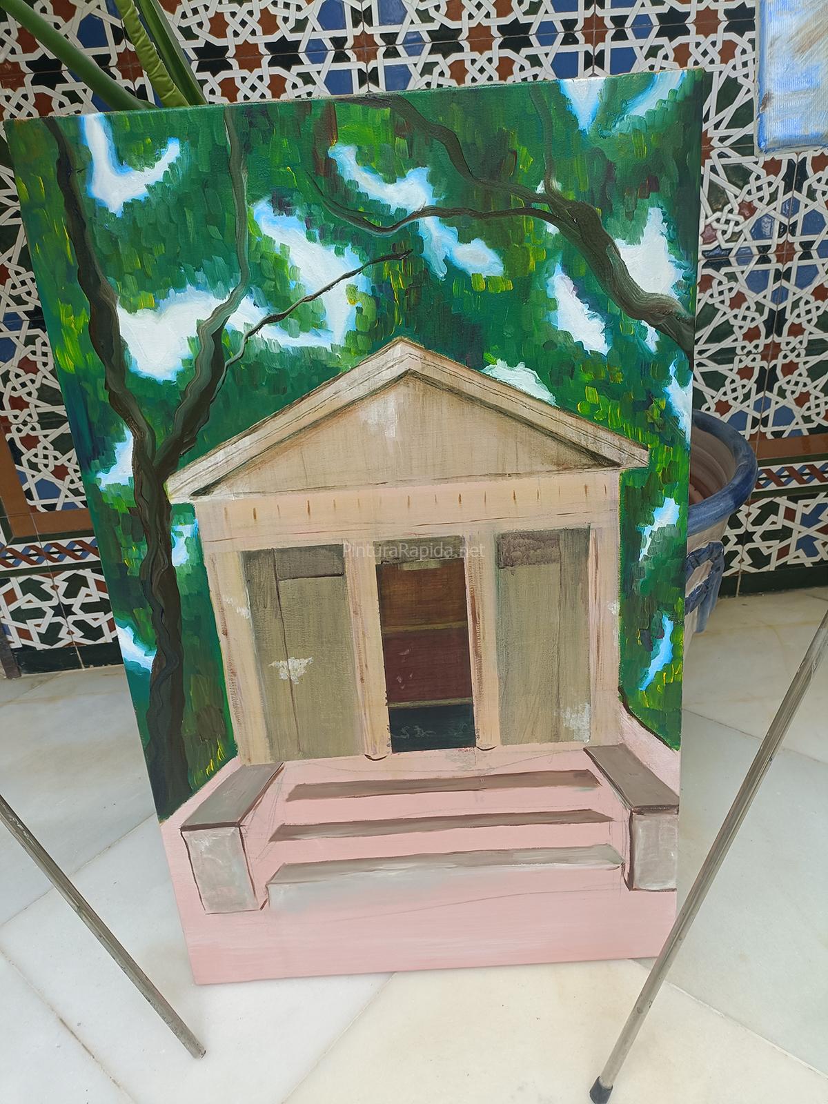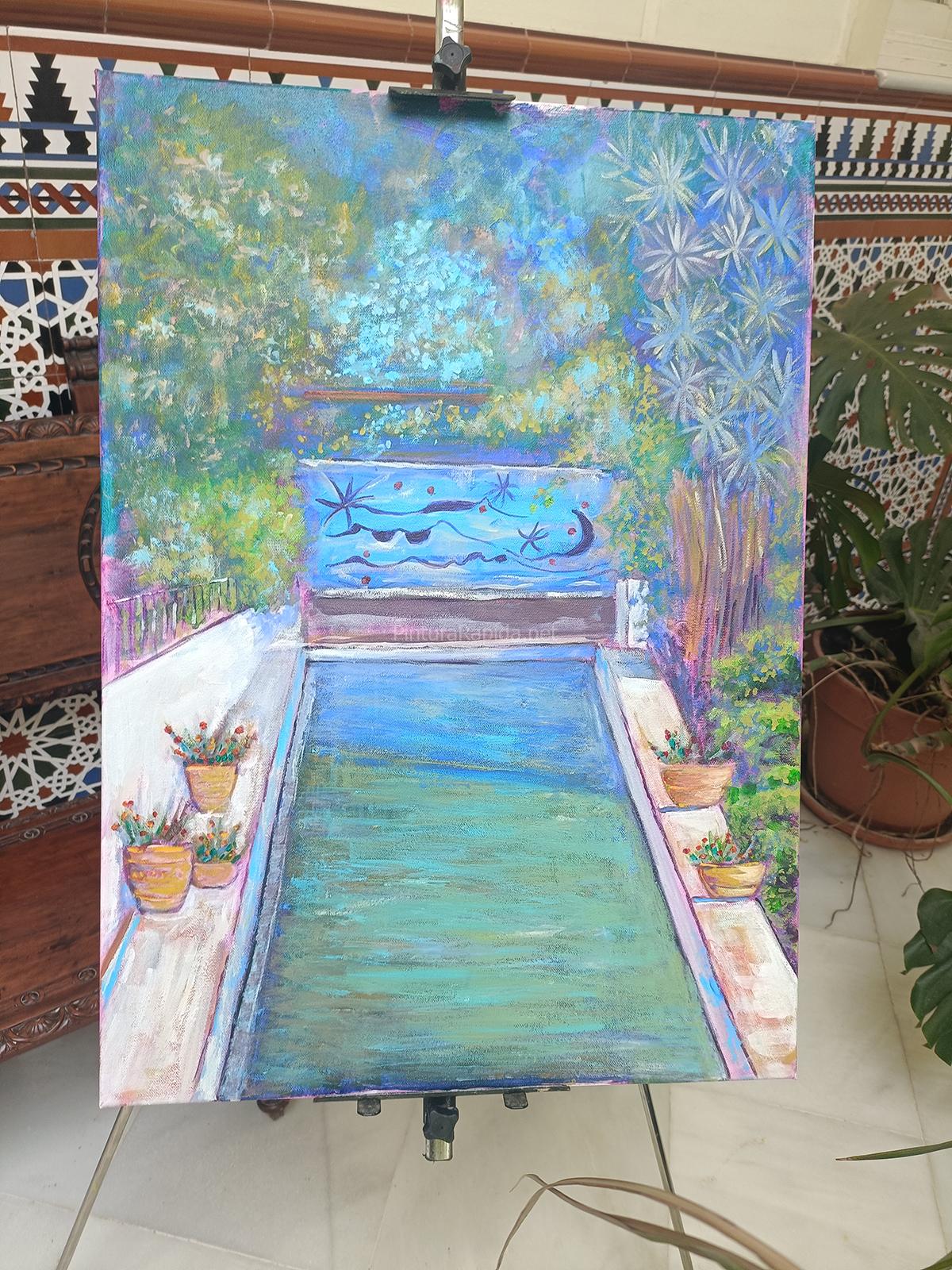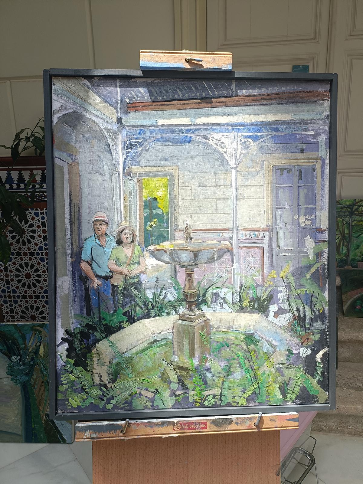 El segundo puesto fue para Adrián Marmolejo, quien apostó por una escena más cotidiana pero igualmente vibrante: un rincón junto al estanque con reflejos y figuras humanas en movimiento, con una ejecución suelta, luminosa y llena de vida.