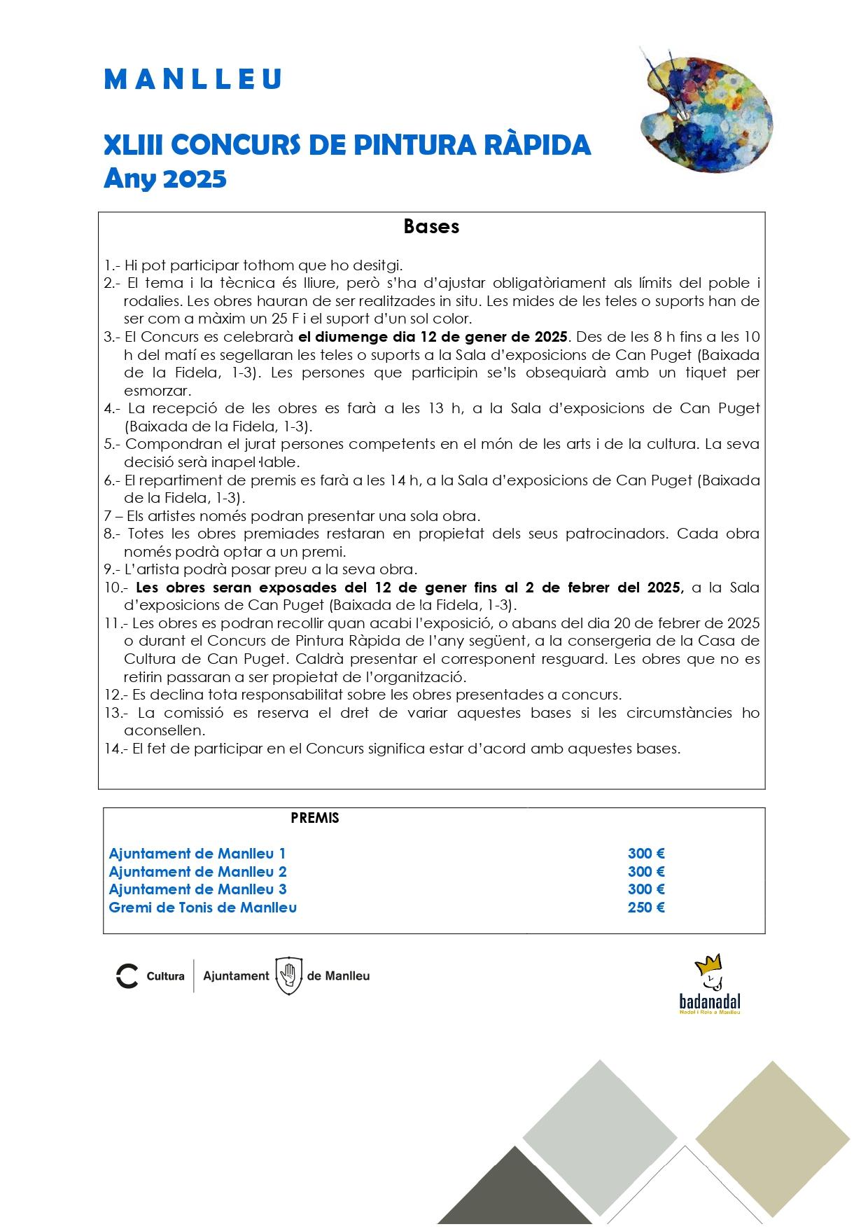 Las obras podrán recogerse al finalizar la exposición o antes del 20 de febrero de 2025 o durante el concurso de pintura rápida del año siguiente, en la conserjería de la Casa de Cultura de Can Puget. Será necesario presentar el correspondiente resguardo. Las obras no recogidas pasarán a ser propiedad de la organización.