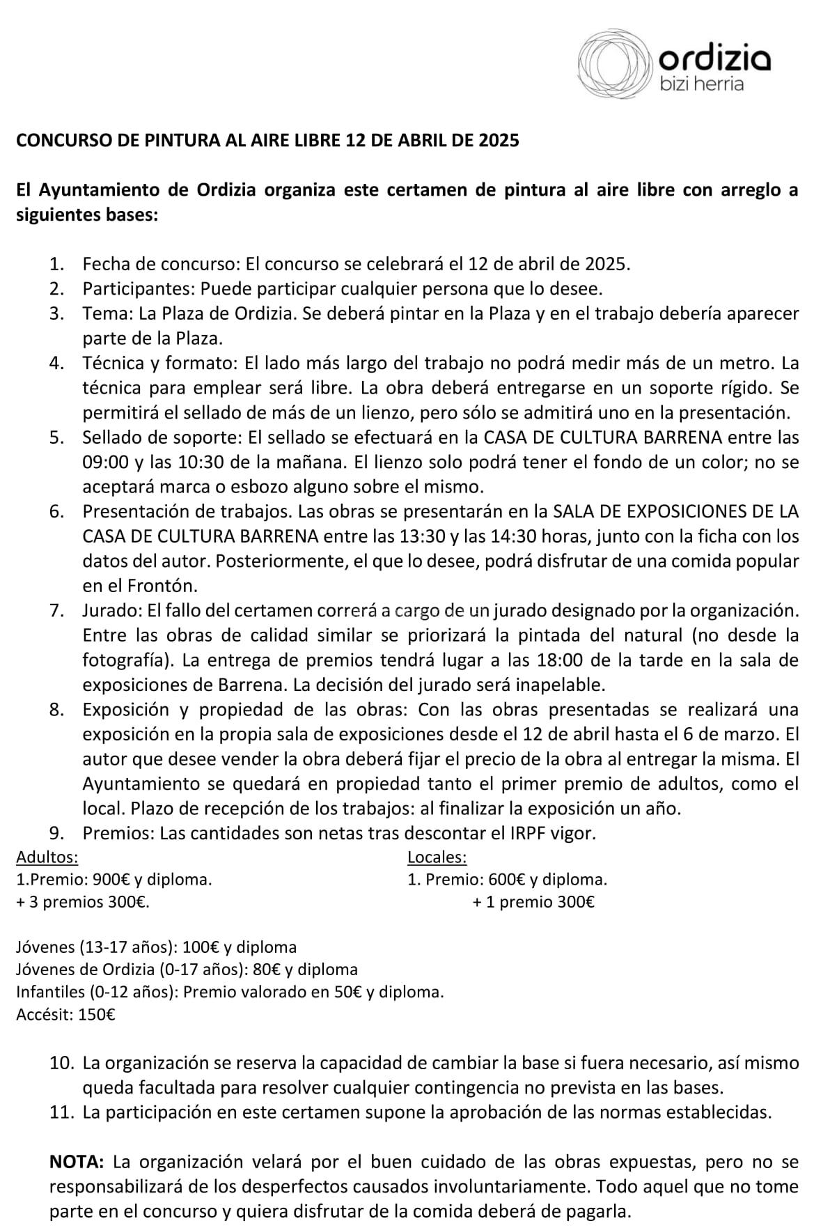 Premios: 900 € – 3×300 € – Accésit: 150 € – Local: 600 € – 300 € – Jóvenes (13-17 años): 100 € – Jóvenes de Ordizia (0-17 años): 80 € – Infantiles (0-12 años): premio valorado en 50 €