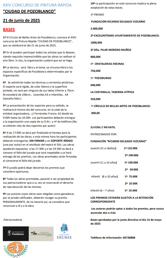 1ª El Círculo de Bellas Artes de Pozoblanco, convoca el XXIV concurso de pintura rápida “Ciudad de Pozoblanco”, que se celebrará el día 21 de junio de 2025.