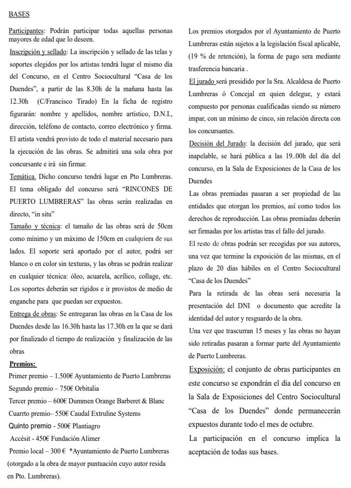 Temática: Dicho concurso tendrá lugar en Puerto Lumbreras. El tema obligado del concurso será “Rincones de Puerto Lumbreras”. Las obras serán realizadas en directo, in situ.