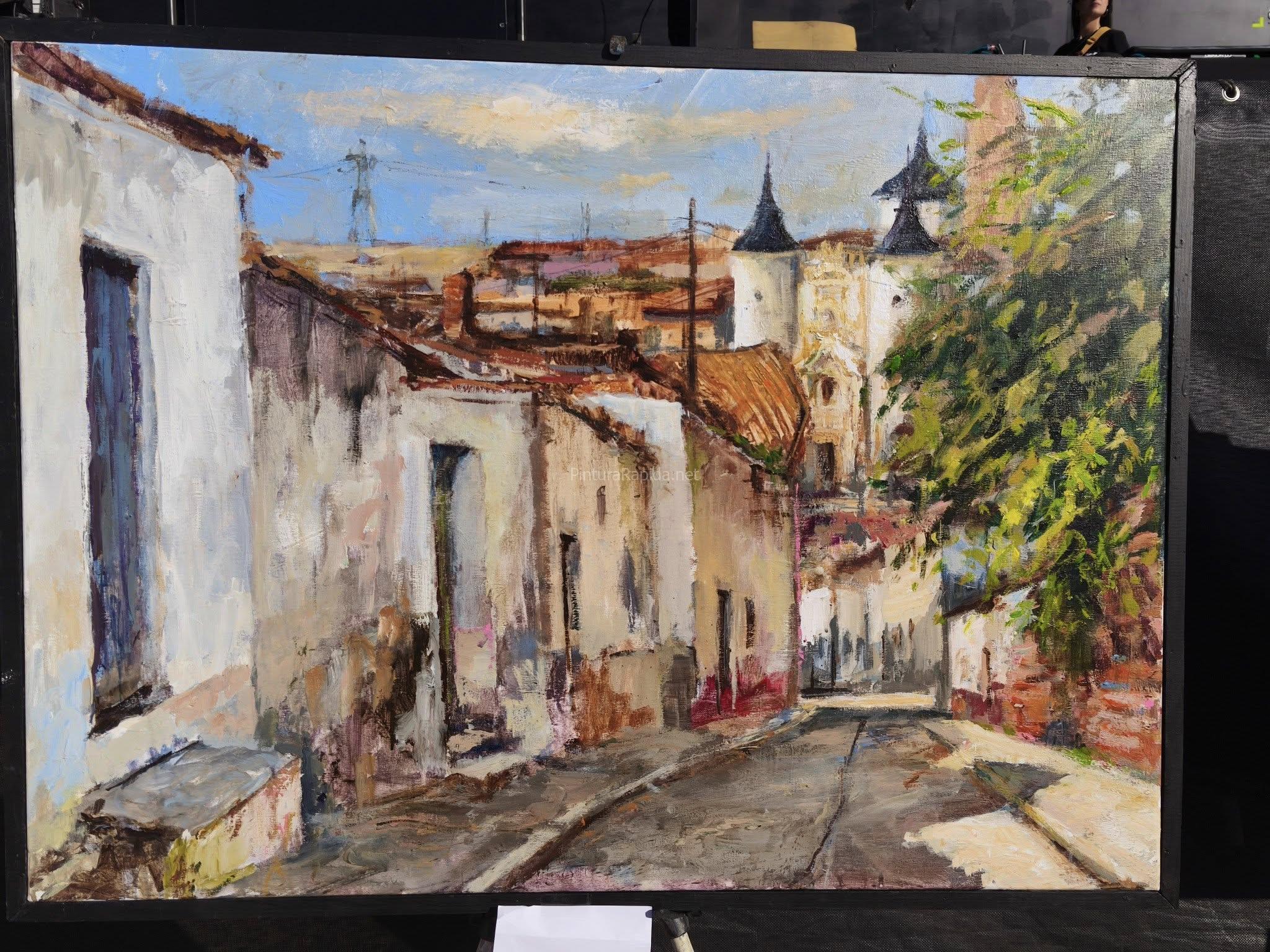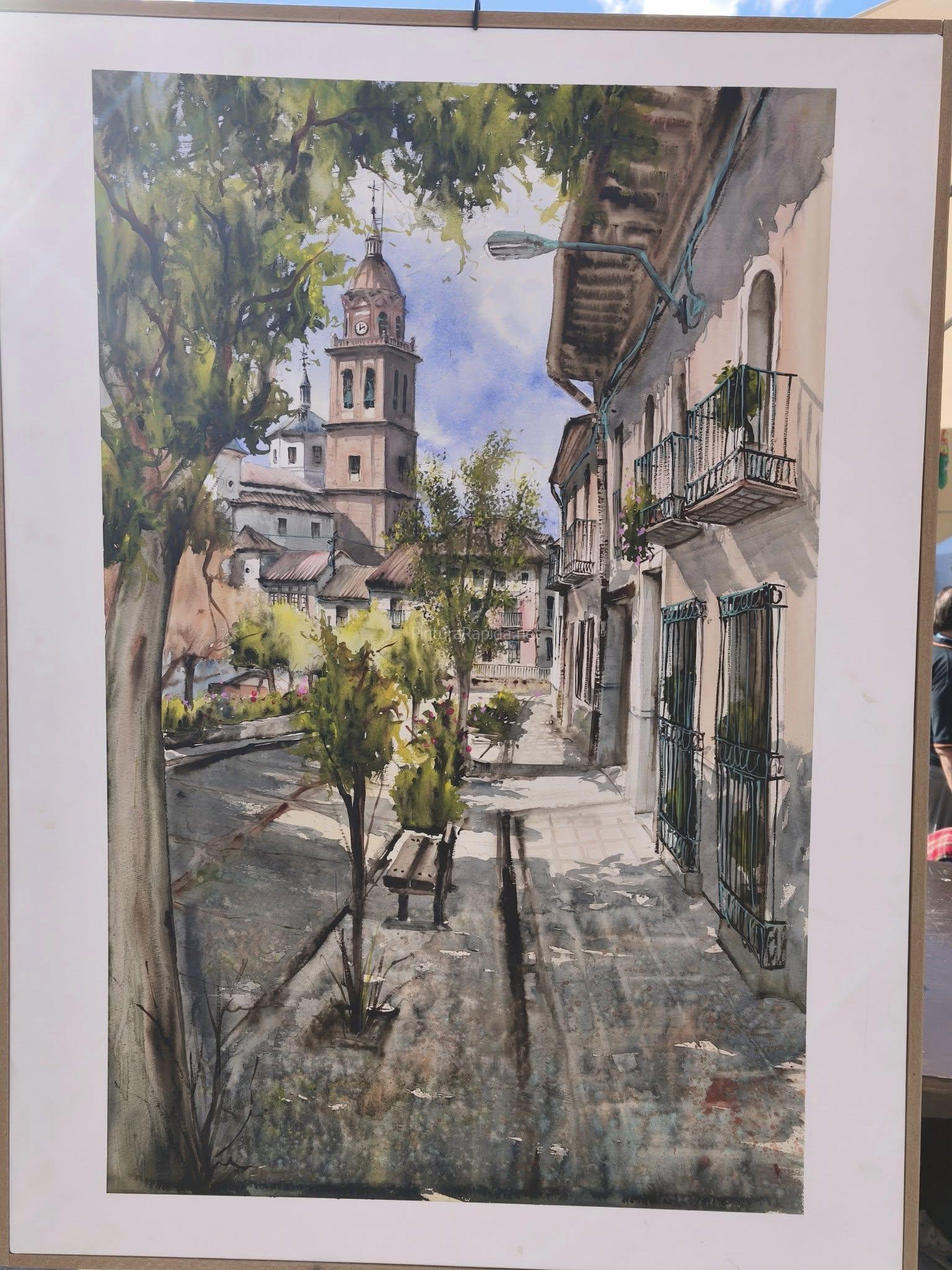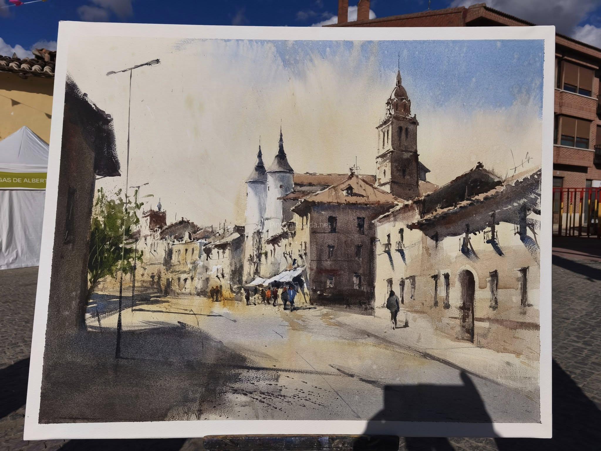 El segundo premio recayó en Eduardo Alsasua, autor de una vista luminosa y perfectamente equilibrada de la calle principal de Rueda, con sus fachadas tradicionales y la iglesia al fondo, capturada bajo una intensa luz castellana.
