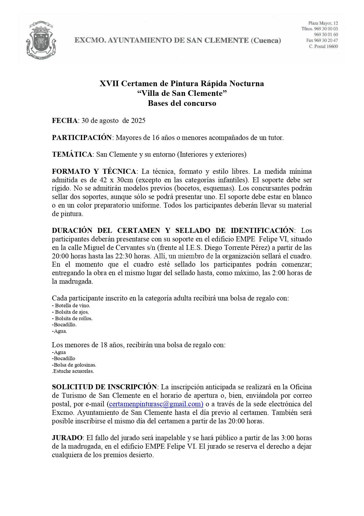 La inscripción anticipada se realizará en la Oficina de Turismo de San Clemente en el horario de apertura o, bien, enviándola por correo postal, por e-mail (certamenpinturasc@gmail.com) o a través de la sede electrónica del Excmo. Ayuntamiento de San Clemente hasta el día previo al certamen.