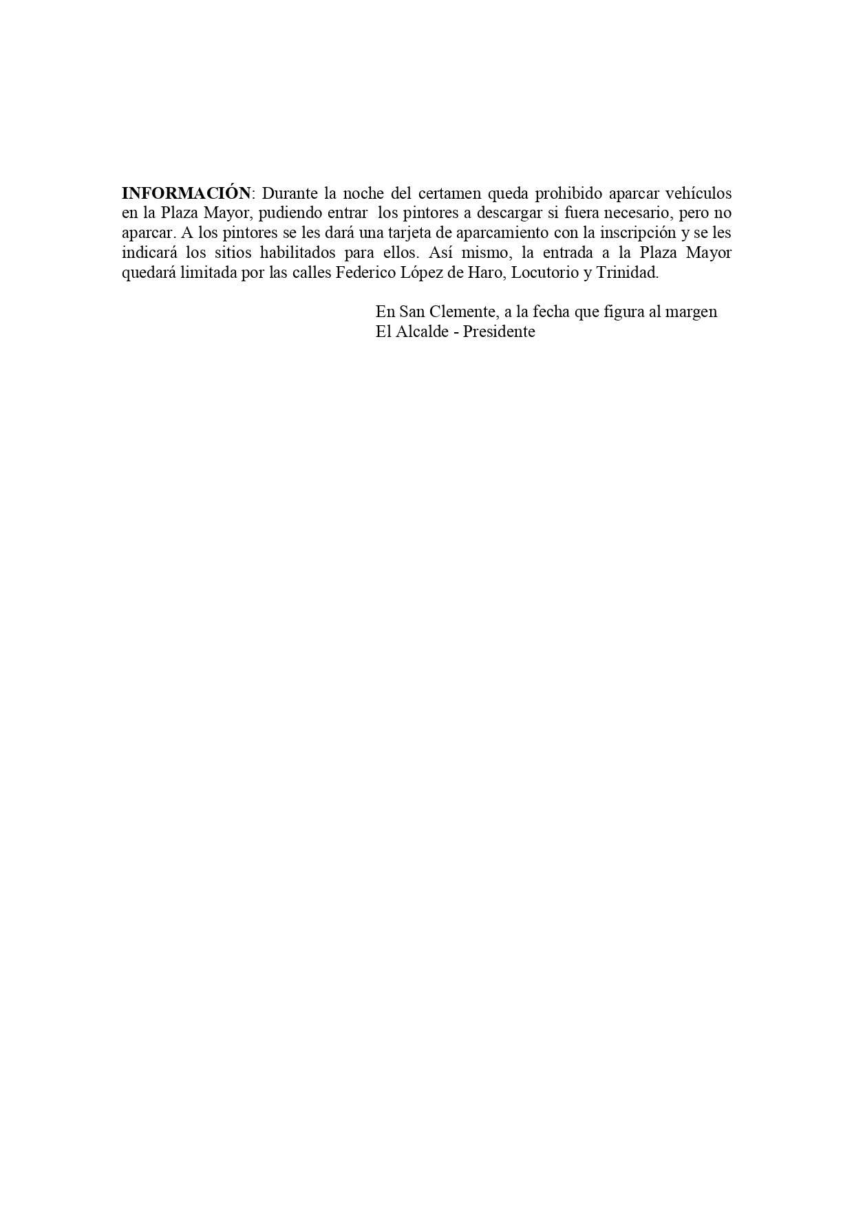 Durante la noche del certamen queda prohibido aparcar vehículos en la Plaza Mayor, pudiendo entrar los pintores a descargar si fuera necesario, pero no aparcar.
