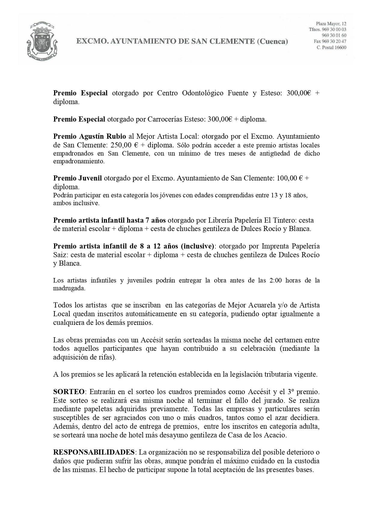 Premios: 1200 € – 600 € – 400 € – Acuarela: 500 € – 5×400 € – 4×300 € – Local: 250 € – Juvenil: 100 € – Infantil: lote material escolar