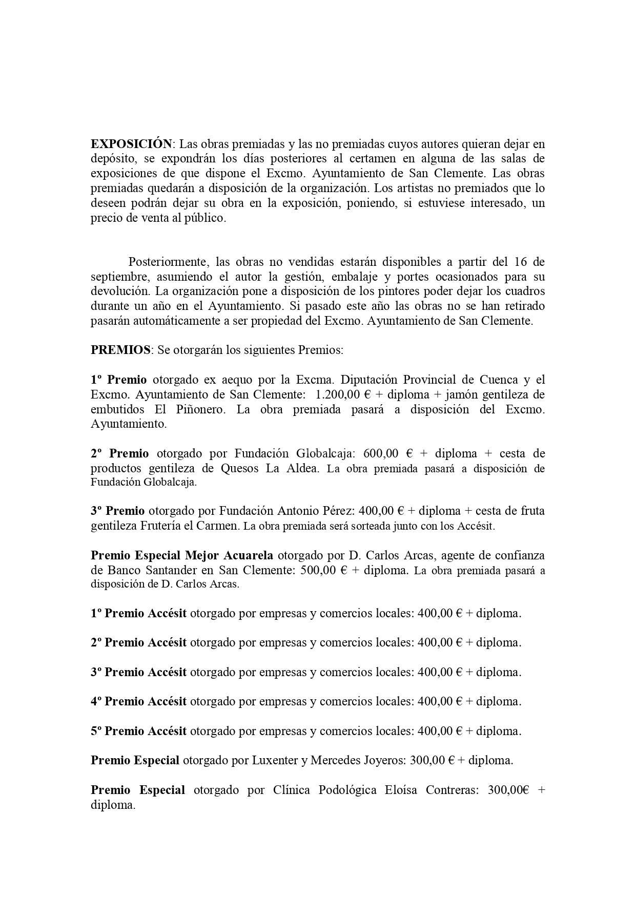 Las obras premiadas y las no premiadas cuyos autores quieran dejar en depósito, se expondrán los días posteriores al certamen en alguna de las salas de exposiciones de que dispone el Excmo. Ayuntamiento de San Clemente. Las obras premiadas quedarán a disposición de la organización.