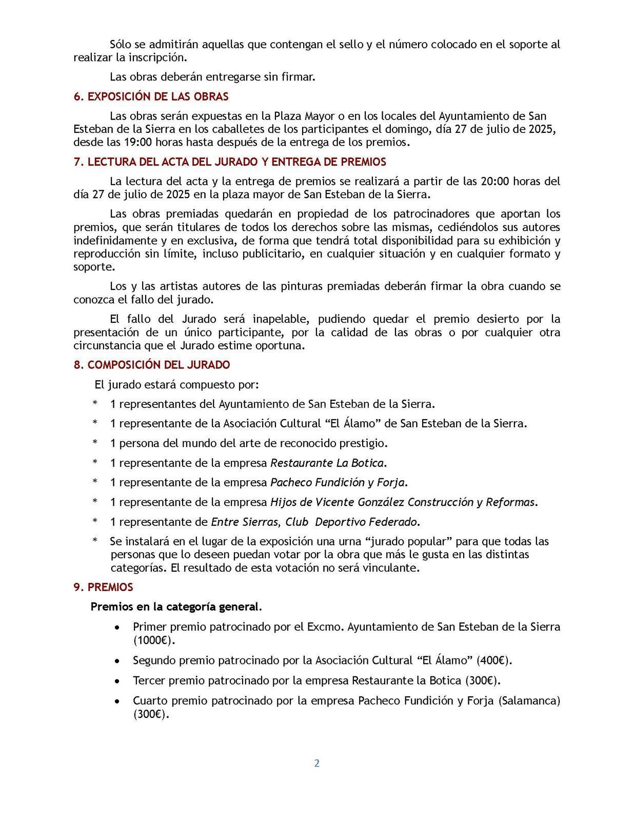 Las obras serán expuestas en la Plaza Mayor o en los locales del Ayuntamiento de San Esteban de la Sierra en los caballetes de los participantes el domingo, día 27 de julio de 2025, desde las 19:00 horas hasta después de la entrega de los premios.
